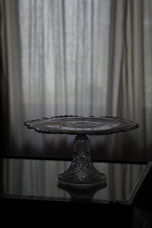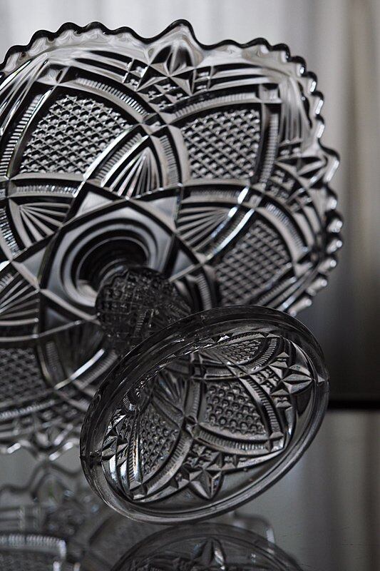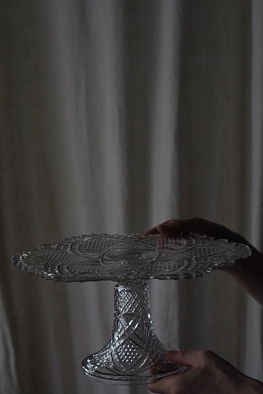 脚から受け皿まで細かい華麗なお花文様にみえるカットガラスのフラットなケーキスタンド。