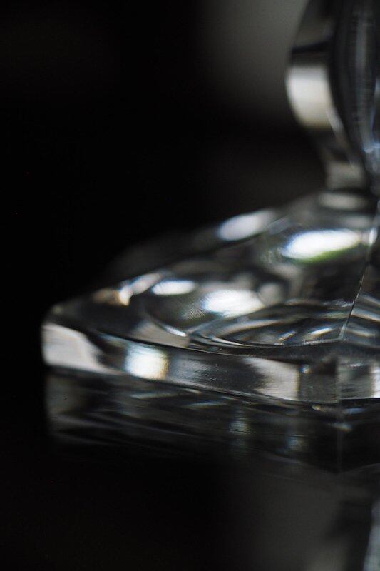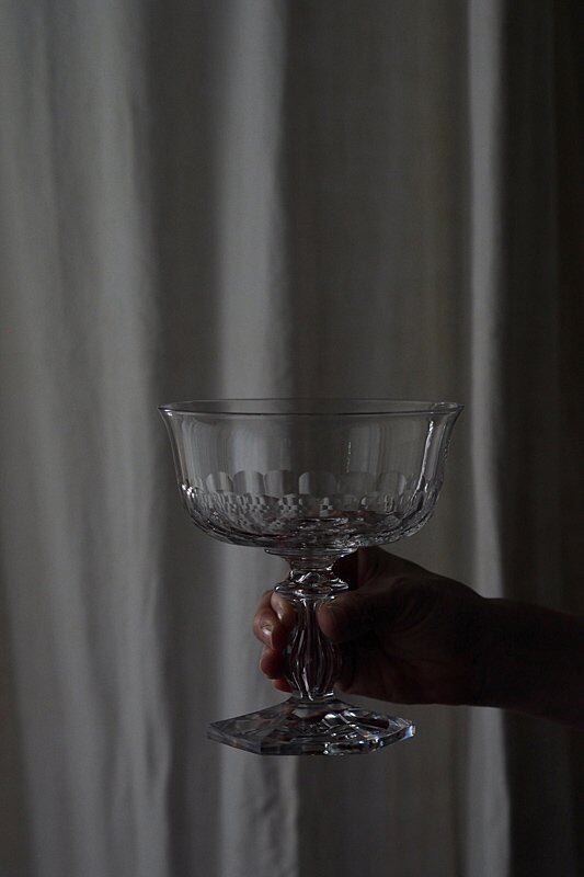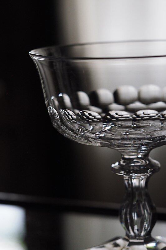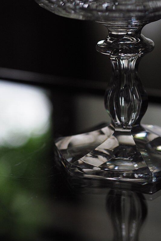 複雑な反射を産み出す繊細な亀甲状カットが施されたクリスタルガラスのコンポート。