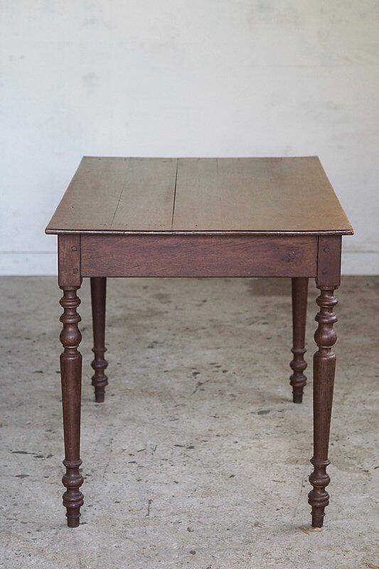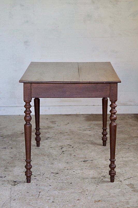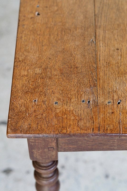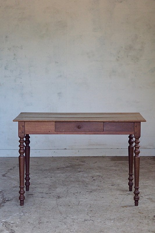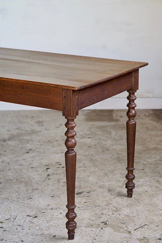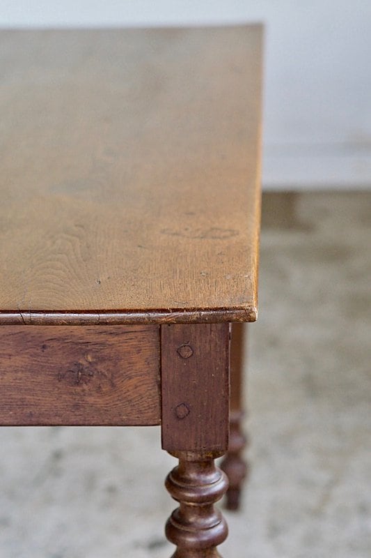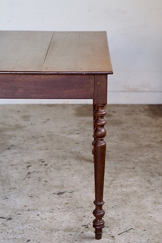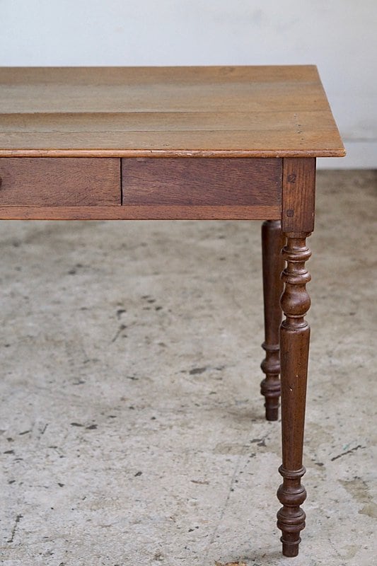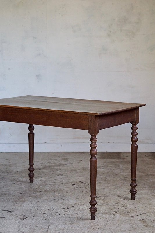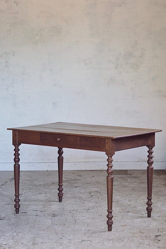 挽物装飾が入った脚も接ぎ天板の薄さからも、硬いオーク材で作られている家具の重重し過ぎる感を抑えた柔らかい趣き。設置するとまるでずっと昔からそこにあった家具の様に馴染むテーブル。
