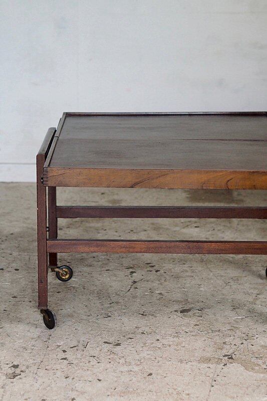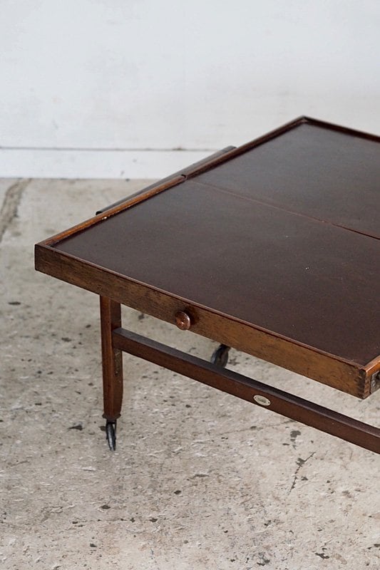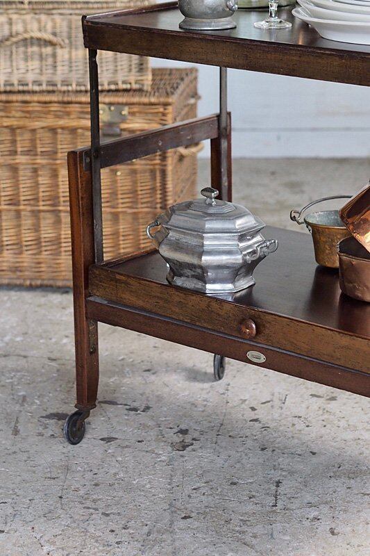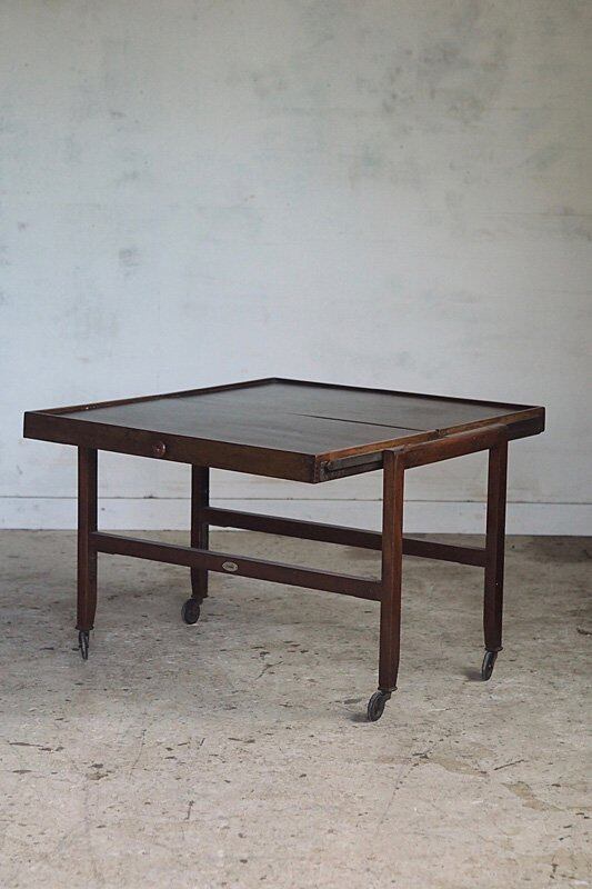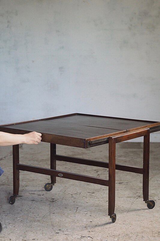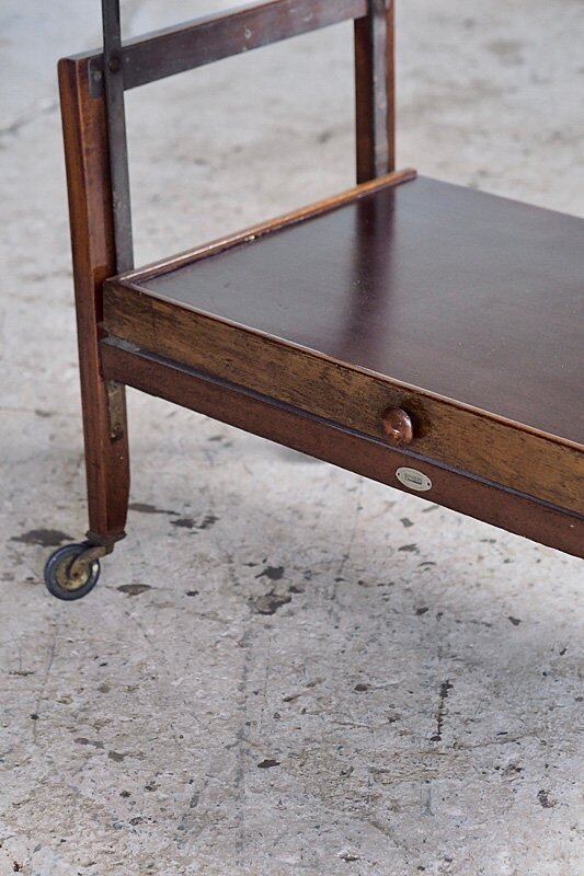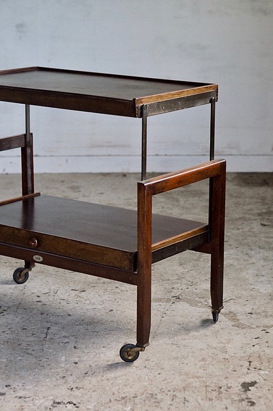 キッチンで作業する際は上下2段でポットや食器を置きスペース活用、お料理が出来上がったらそのまま脚のキャスター回転が滑り良く食卓にコロコロと運べる優れもの。天板面積が倍になる1段拡張は丁度ソファサイドのローテーブルとした高さ、お茶の時間にも使える。1927年にイングランド特許276140号取得をした製造元、ベスウェイ社のアールデコなトローリー。時と場所で形を変える事が出来るメタモルフィック-変成なテーブルとして1929年の英国産業見本市に出品した。キャスターの動きが良い為片手でテーブルを押さえつつ、になりますがBeswayロゴの上部摘みを引くと天板が動き上げ下げ可能、片方の鉄支柱稼働部分に錆びている箇所があり僅かに干渉する様で1段にする際、最終的に手の平でポンポン、と軽く天板抑え平らにした方が良いです。上段の天板サイズはw760(735) d460(445)、1段仕様にするとw760(735) d917(893) h560(550)です。