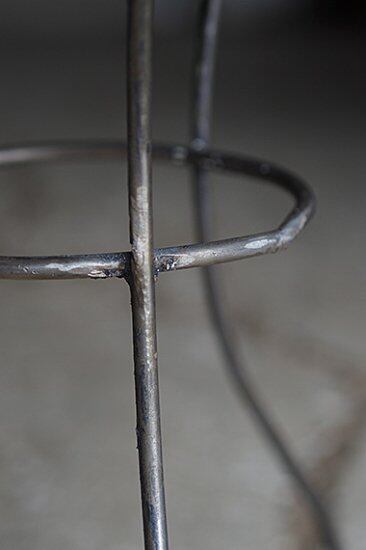 買い付け時白い塗装が施されておりましたが、既に天板全体に錆が出て来ており、剥がしてアースカラーな鉄色を出し、グリーンと共にシックなベランダ、軒下のガーデンに。センターの2点のリングで留る構造で、どうしても肘を付いたり強くお品物を置くと揺れますのでご注意を。