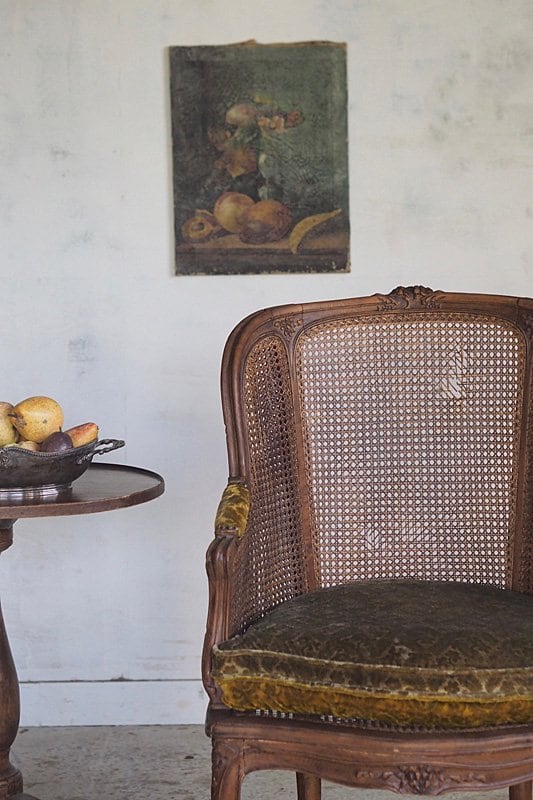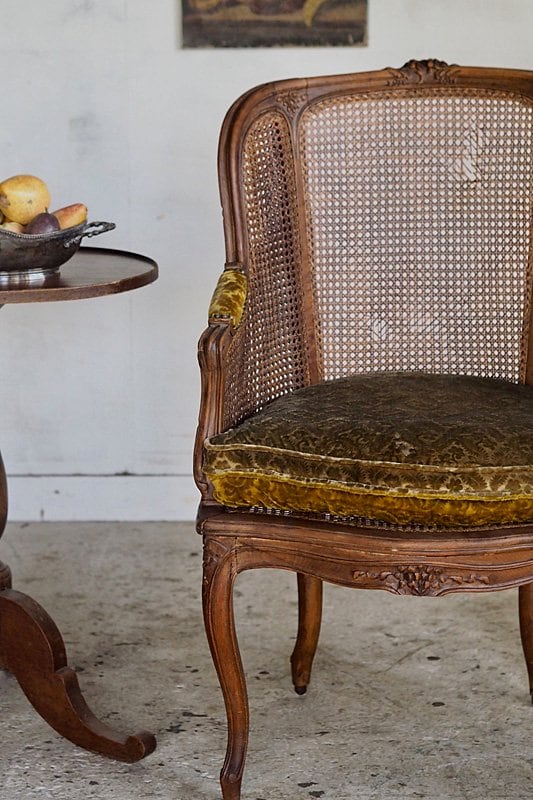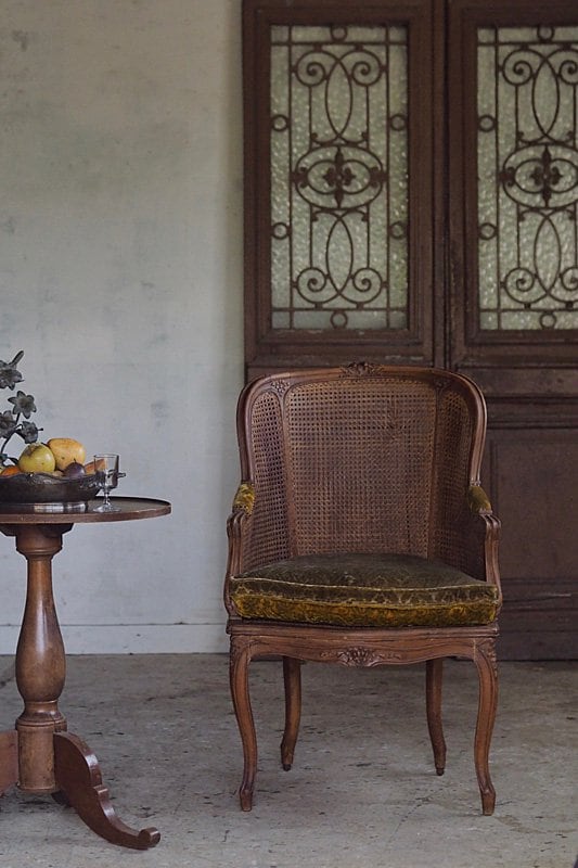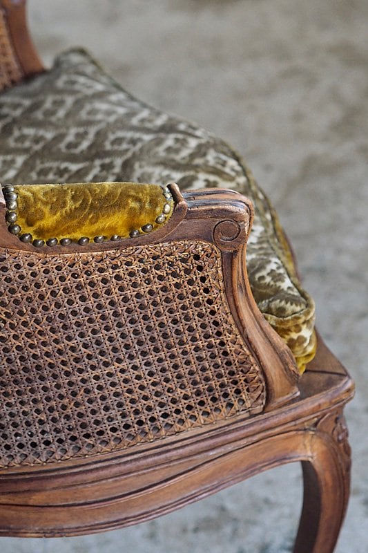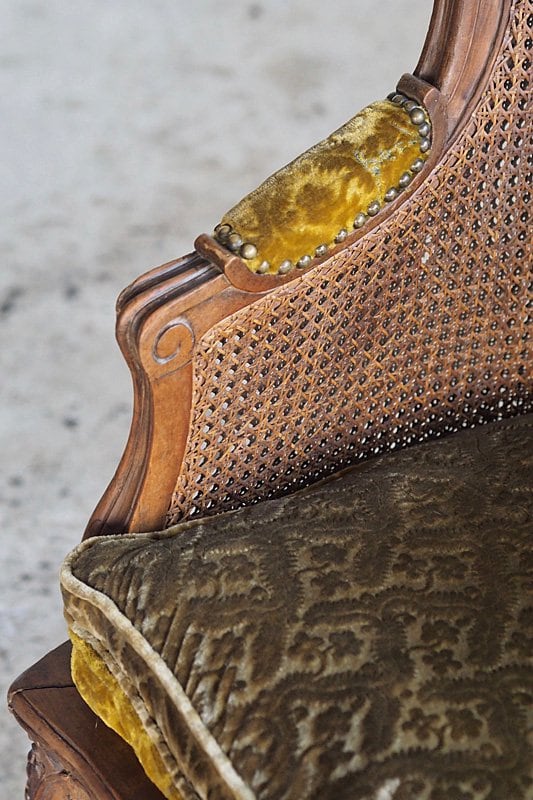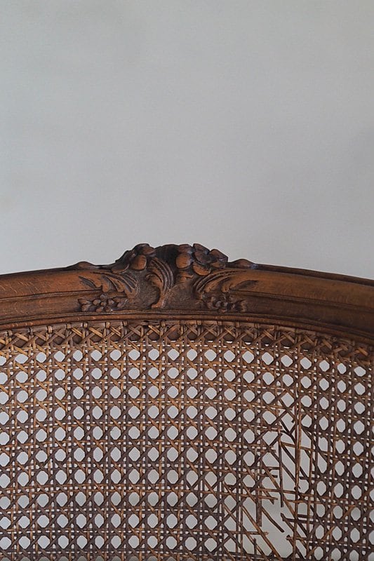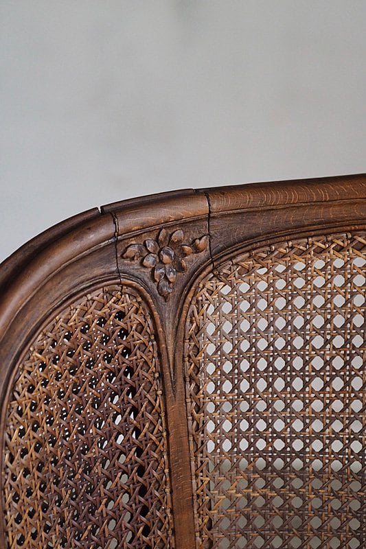 ロココの華やかな雰囲気とはいえ岩と貝の擬集体が複雑に左右非対称にデザインされた最盛期より抑えた、上品な小花装飾木彫りがカブリオール(猫脚)や座枠、笠木の目が届くところにフェミニンな感覚で収まっている。