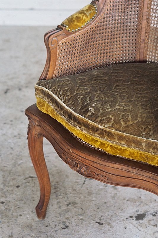 背もたれラタン編みに画像の通り一部穴が開いており、座面編み箇所はややたわんでおりますが今の所問題なく座る事可能です。アームと揃い生地の座面クッション付属、クッション込みの座面高はsh530mmです。