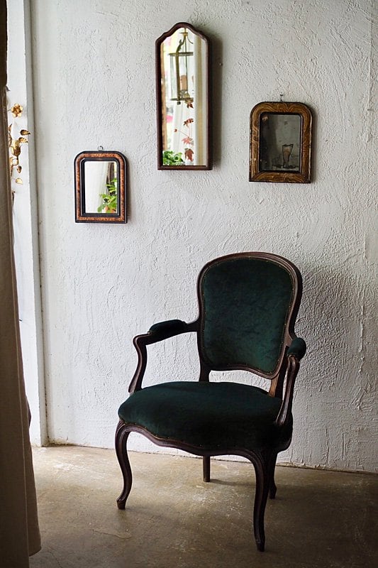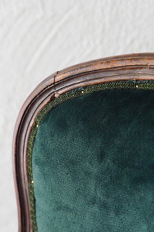 新たにフレームのローズウッド色に馴染みシックな印象を残したくダークなグリーンモケット生地で下地ウェービングテープから張り替えました。
