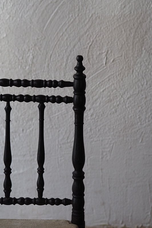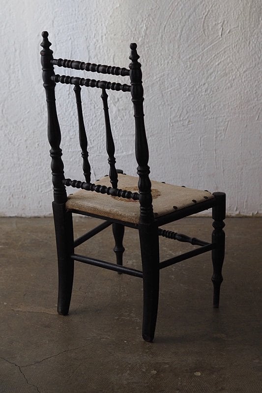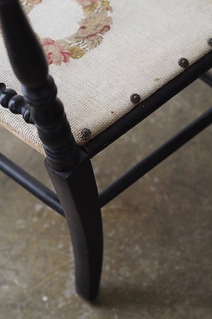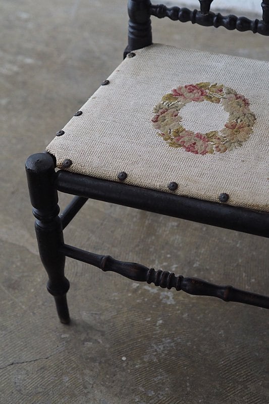 ポエジーなお花の刺繍がリースになって咲く座面、黒いフレームには挽物装飾が施されており壁に沿った際そのラインが映える。お人形やテディベアをお座りさせて、優しい雰囲気に満ちた空間を。