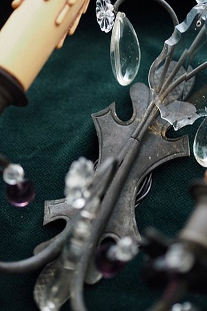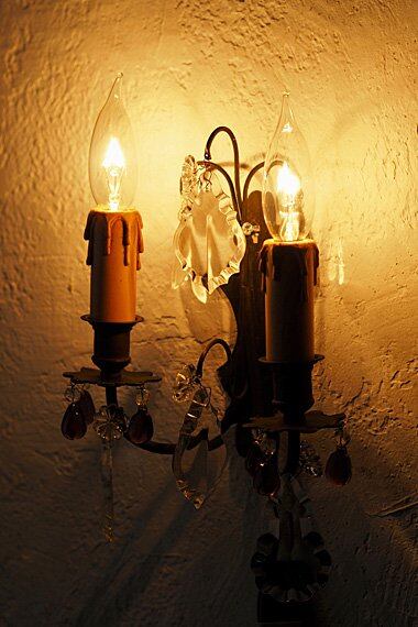 シックな涙型のパープルドロップが灯りの元でレジメンタルな影を造る、その見た目、蝋管受けにあしらわれたフリンジ飾りの様。