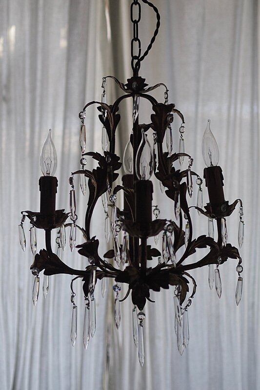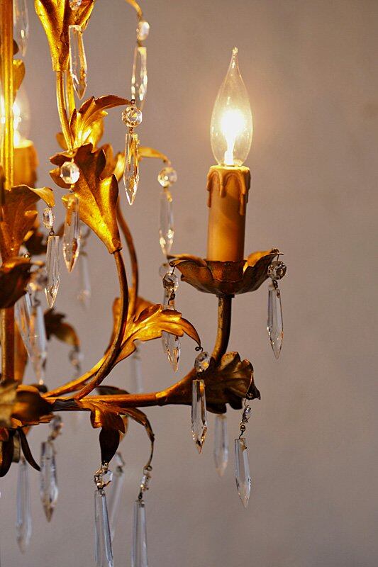 シャンデリアのアームに絡む鋸型の葉装飾が一枚ずつ葉先が反っていて可憐な雰囲気、その間を貫く沢山の氷柱状ドロップは決して煌びやかにならない、余す所なく一つでひと塊りに、引いて全貌を眺める立ち位置からが一番美しく見える。