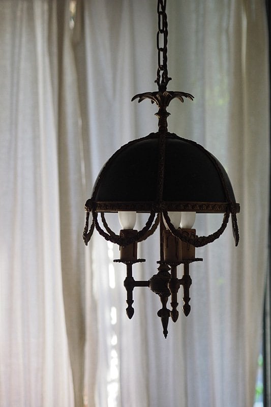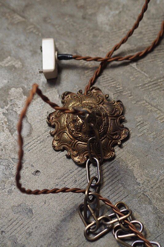 本体より1M真鍮チェーンとブラウンの捻りコードが伸びており先端にオリジナルのフランジ付属ですが引っ掛けシーリングが隠れない仕様となります。