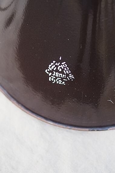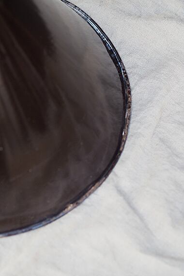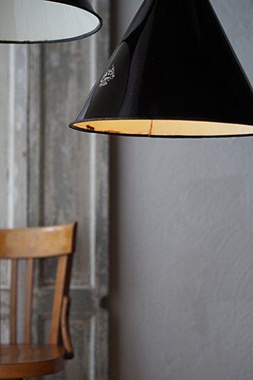 エナメルシェードの直径広く、陶器ソケットから縁までそこそこの距離がある為、下方に向け柔らかい灯りを届ける。宙に下がるユニークなフォルム。
