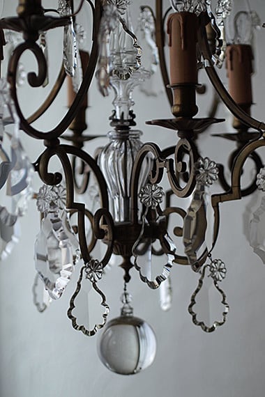 段違いに位置する燭台部分は、一方が配線を露出させず細いアームの内部空洞に配線を通していくアンティークのシャンデリアならでは、な複雑で且つ見栄え良く、一声唸る造り。