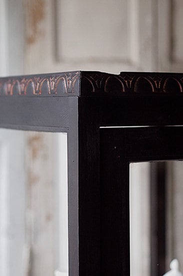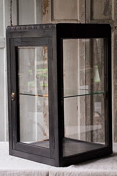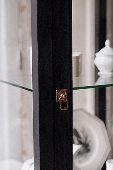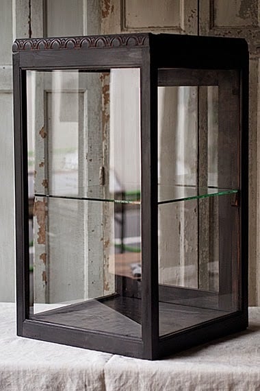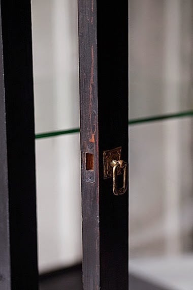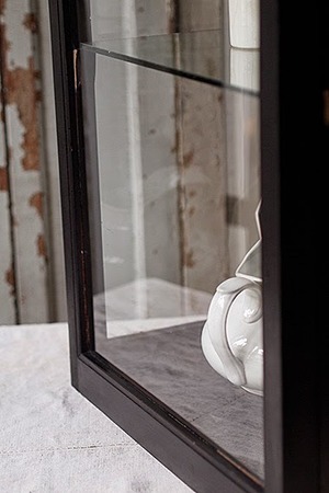白い壁にくっきりと線を描くミニマルでいて品格の良いショーケース。四方トップに巡る装飾ディティールと、真鍮の引き手が主張するのみ。