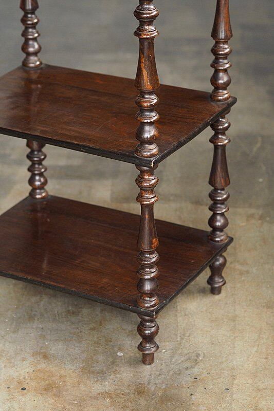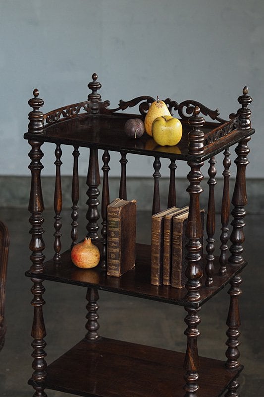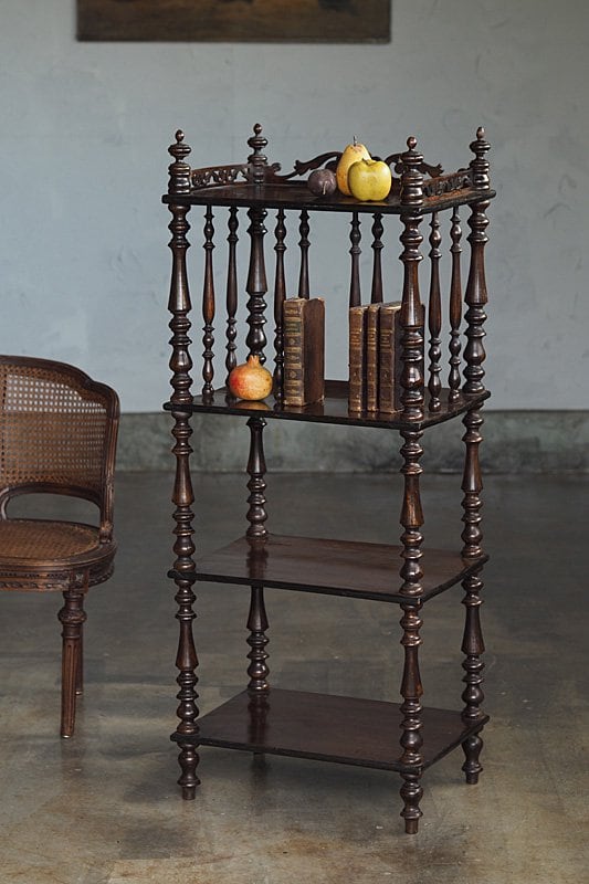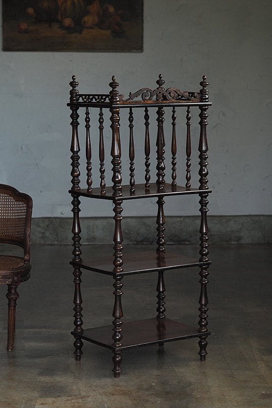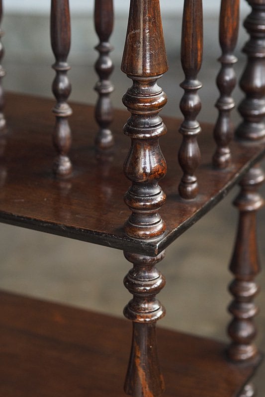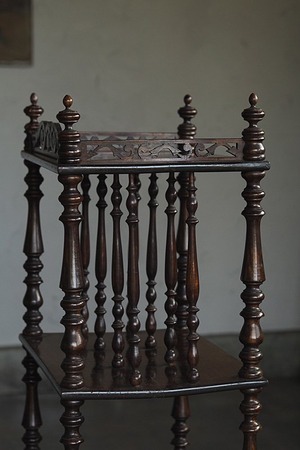 上品な光沢と木目で、各支柱の挽物装飾も脚に至るまでエレガントな趣き。
