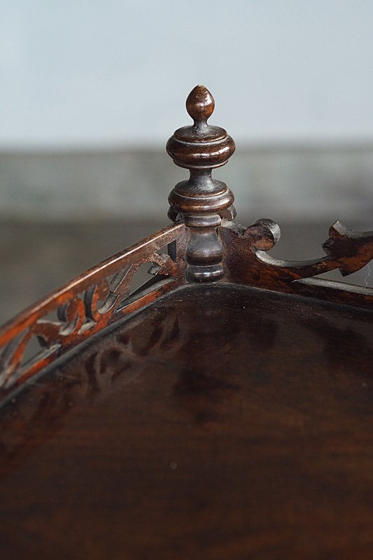 透かし装飾の美しい枠が天板を囲う、譜面を仕舞う総マホガニー材のシェルフ。