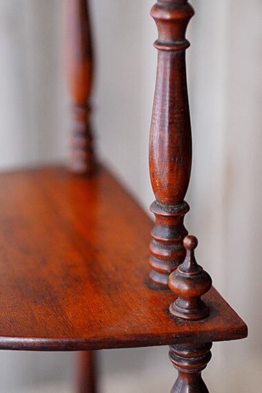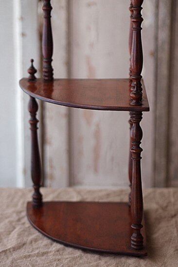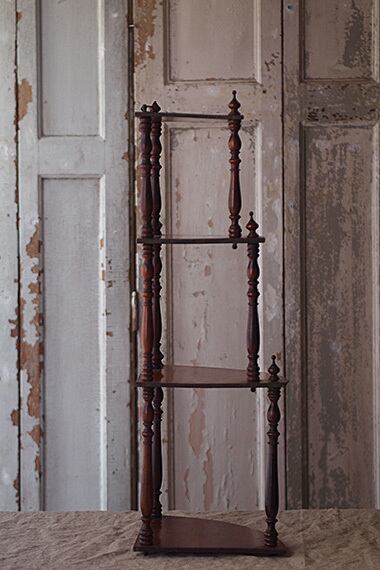 壁に吊り下げるオリジナルの金具がトップ天板角に揃っており、ダメージと致しましては向かって右側トップ擬宝珠の先端の欠損、下から2段目板左側角裏面にスライス状のチップが御座います。