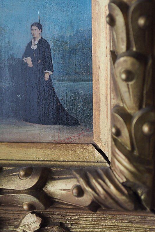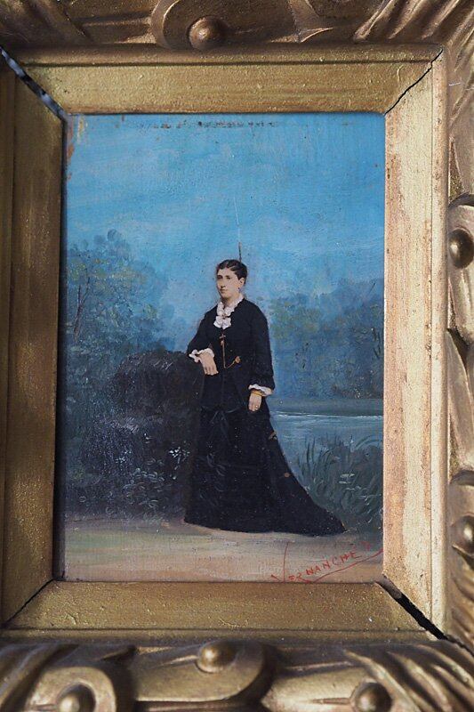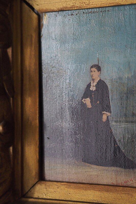 只、写真板の上に油絵彩色した方法で委託肖像画を手掛けた作風とこちらの油絵には似た点が。こちらの女性のお顔と両手はとても小さい割にスフマート(ぼかし)技法が良く虫眼鏡で見ても描け過ぎる程。