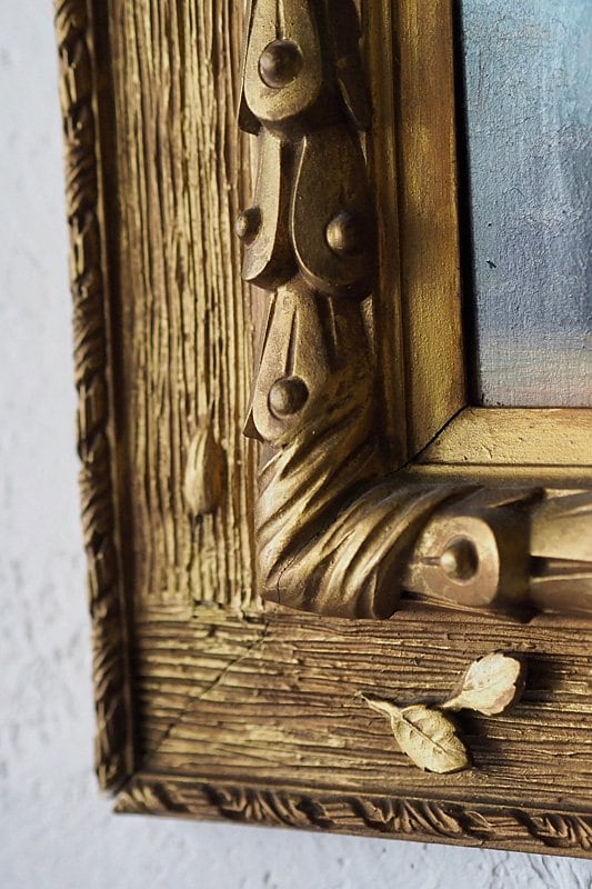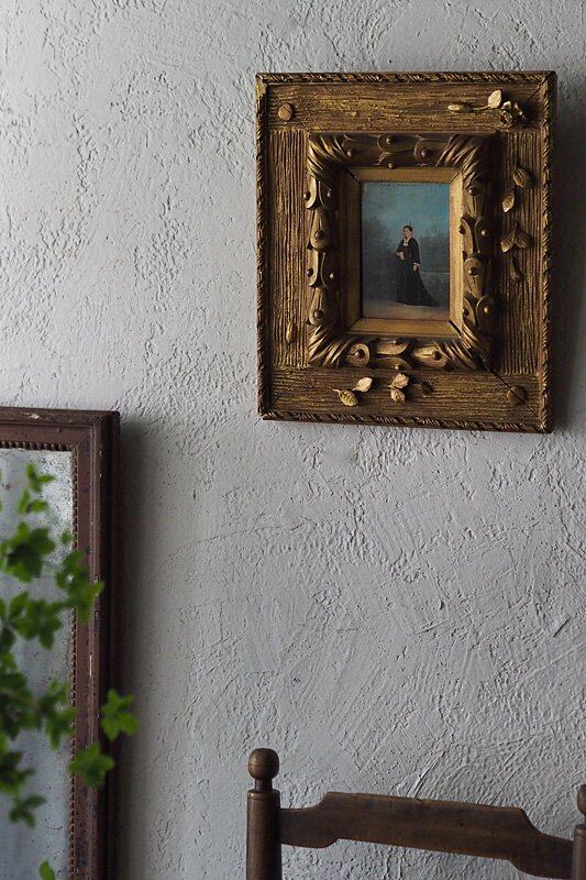絵の中の世界観とのギャップに見れば見る程癖になる額縁、摩訶不思議な木彫りモチーフはこの油絵の為に誂えられたに違いない。
