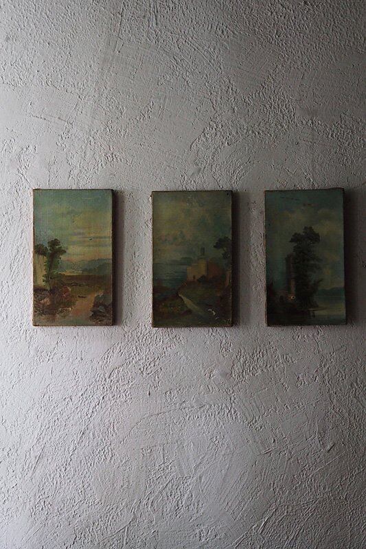 絵の横繋がりはないですが、青い空ともくもくとした雲、佇む樹木と繋がりのある3連の油絵。