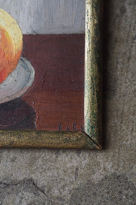 果物、野菜のもつ歪な形、複雑な色を追った一枚の油絵。