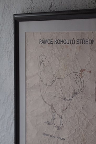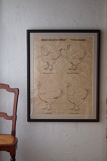 酪農・畜産学校で使われた鶏の品種が描かれた一枚、買付時より皺が寄り柔らかい風合いに変化したポスターを額装。
