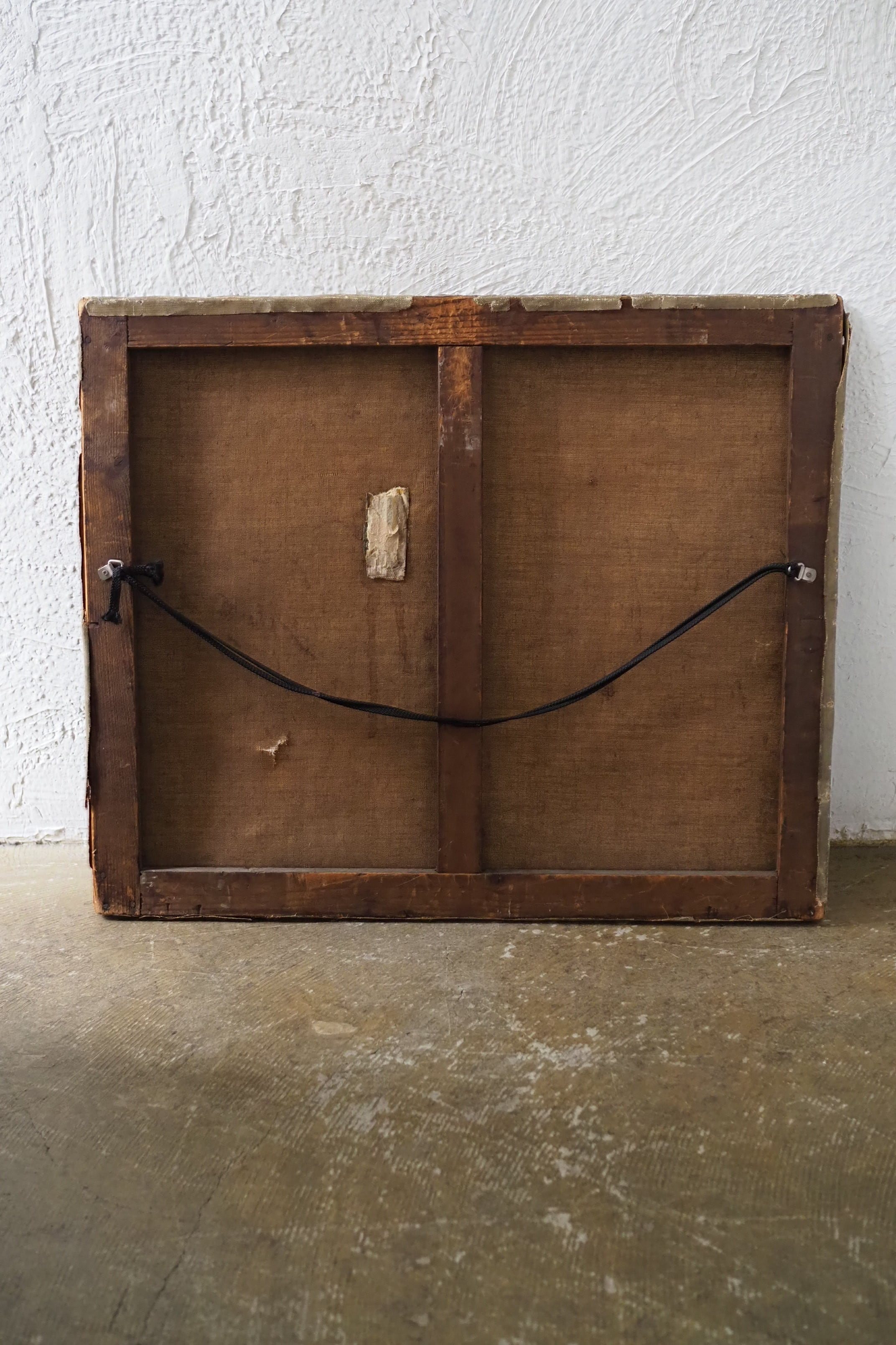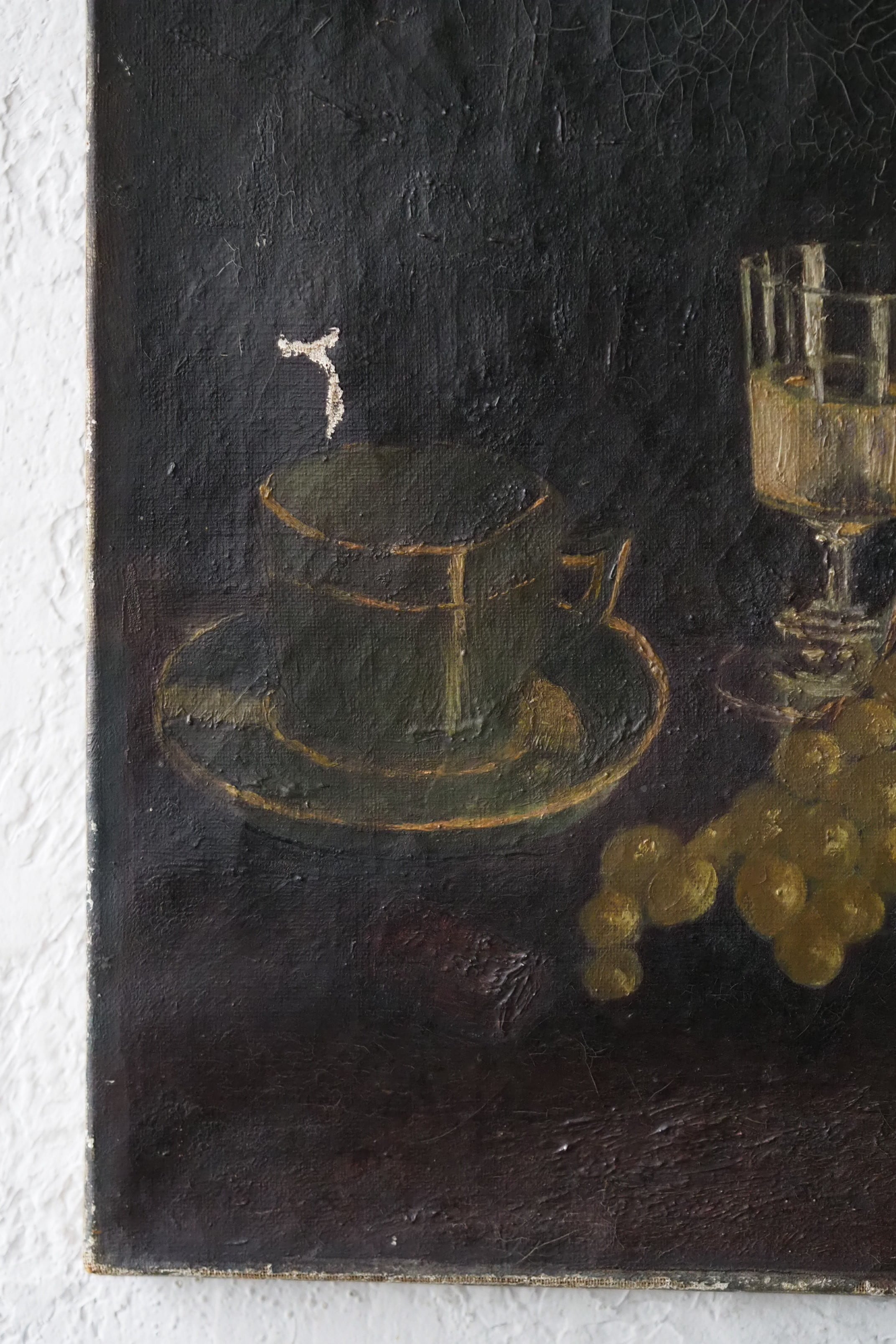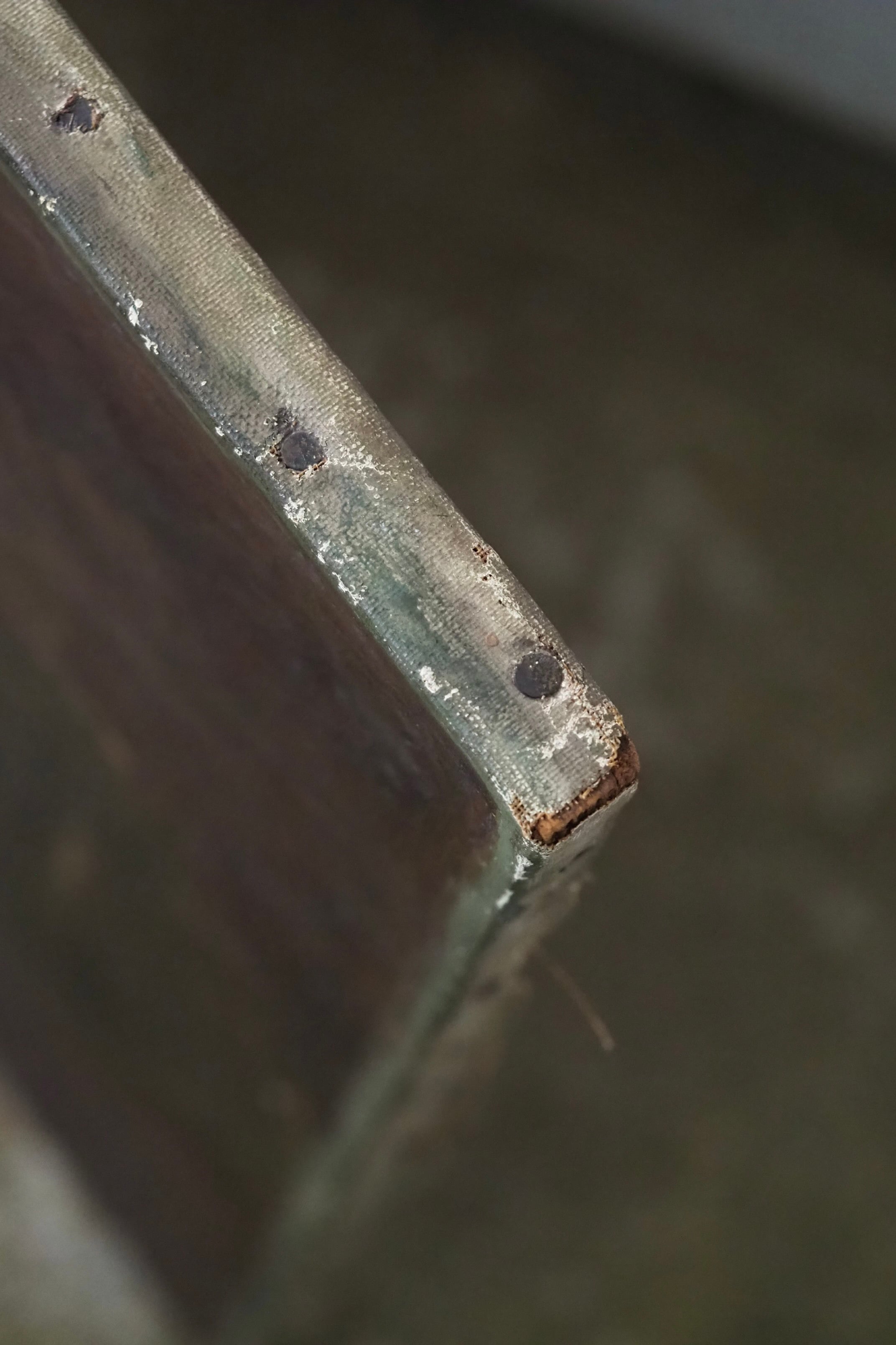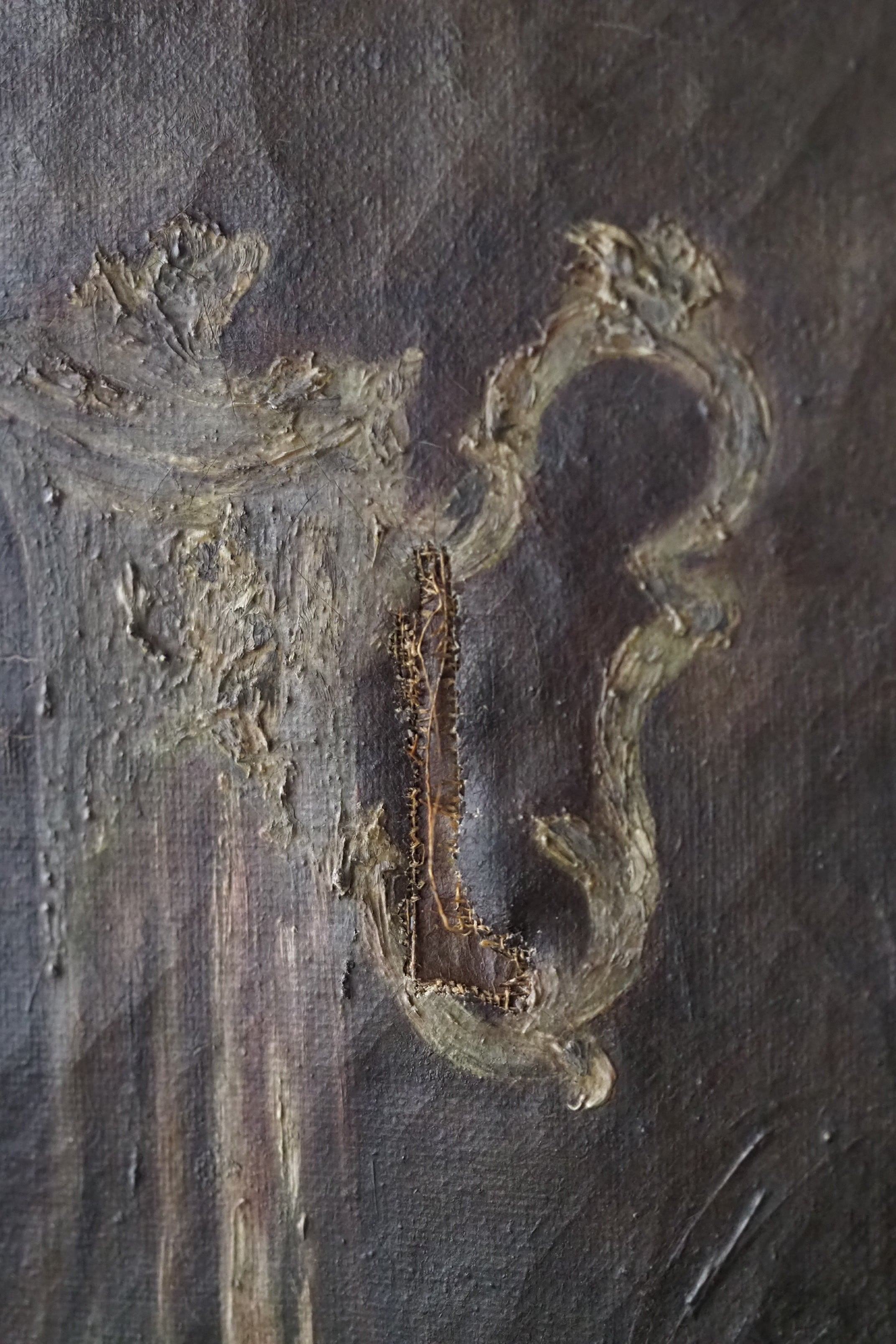 キャンバスに開いた穴は2箇所、ティーカップの上辺りに擦れ傷が御座います。