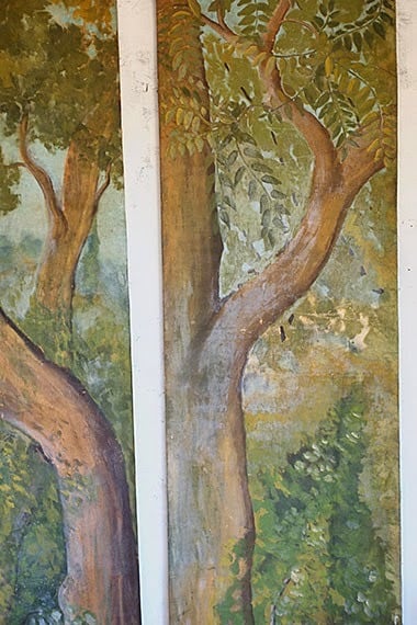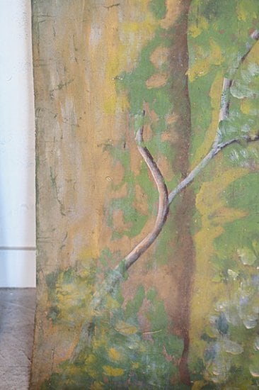 演劇舞台背景に飾られていたお品と思われ、ハムレットに登場する薄幸の乙女オフィーリアを囲むグリーンの深い深い森の慈しみを思い起こさせる。