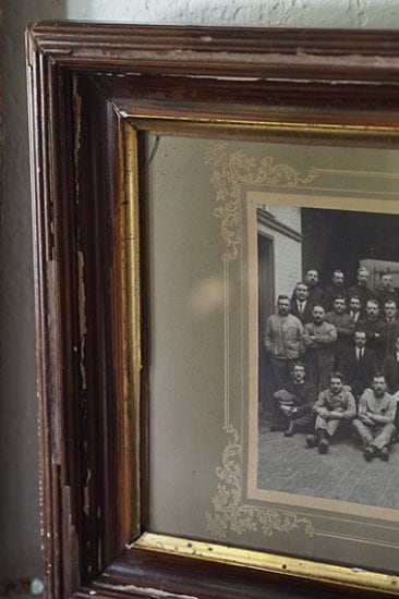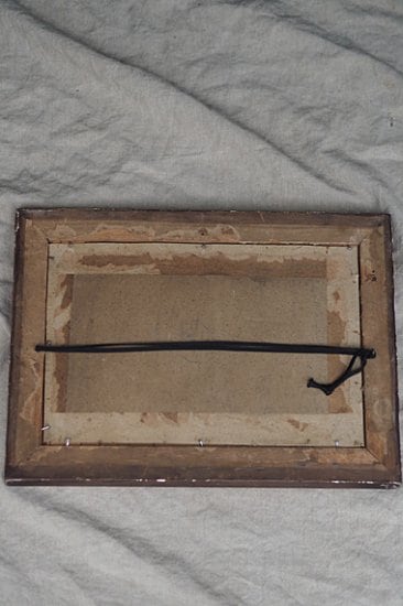ベルギーの額縁屋さんの印がマット紙に、背面の釘に錆びが出ておりましたので新たにキャンバス釘で留めておりますが額装はこの100年を通じて変えていないはず。