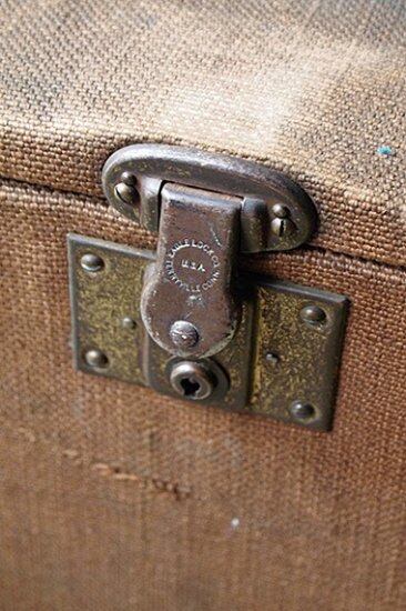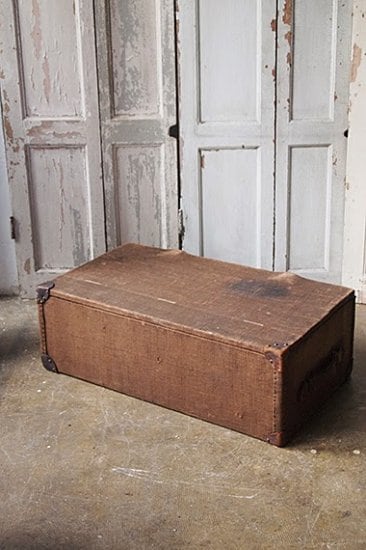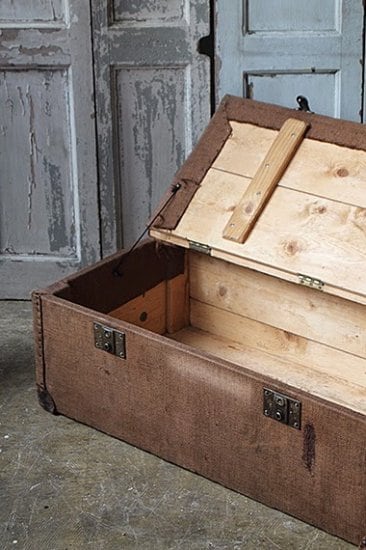 ブラウンの布で包まれたトランク。中は木製でしっかりした作りです。