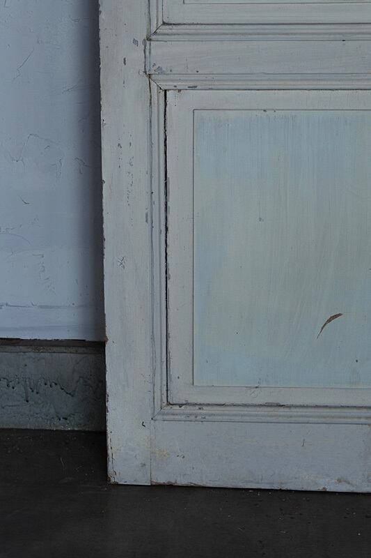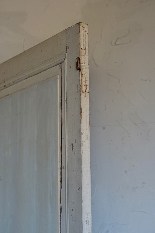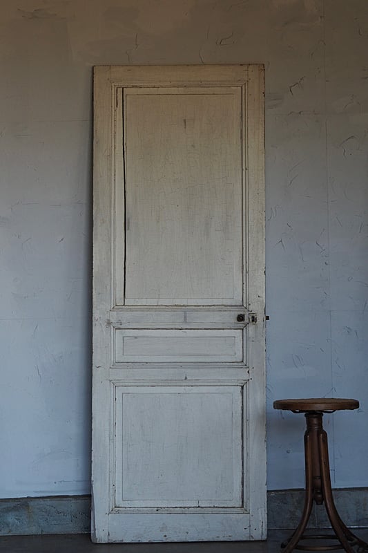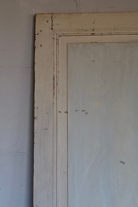 壁に立て掛けて古い塗装がラスティックな雰囲気を時に層になったペイントの加減は設えに奥行きを保たせるパネルドア。