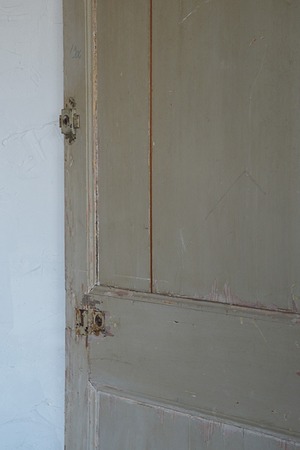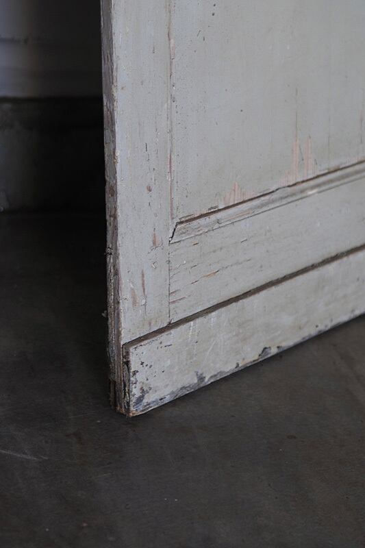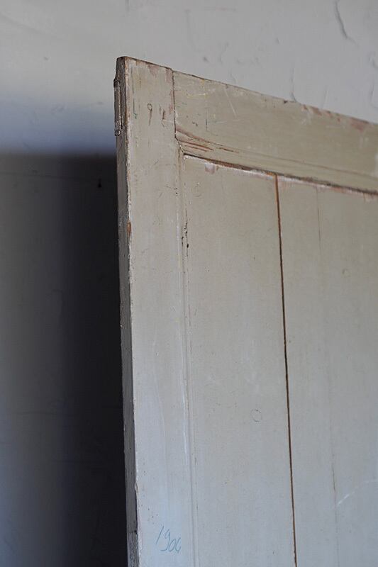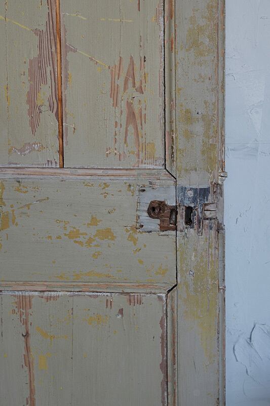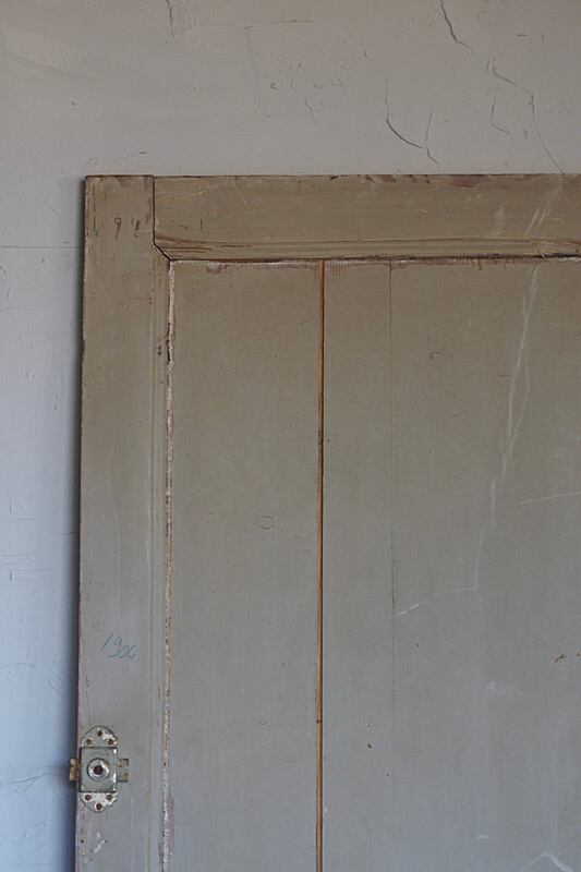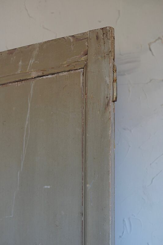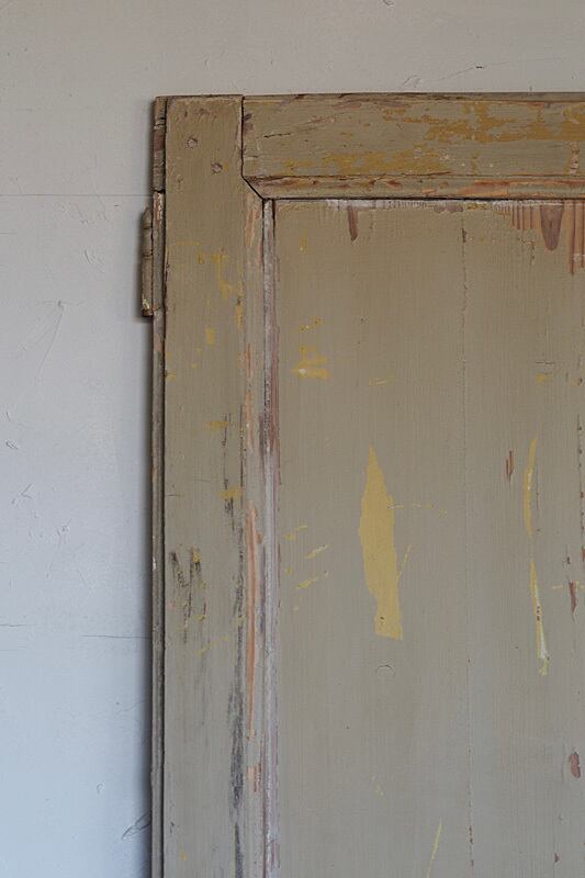 壁に立て掛けて古い塗装がラスティックな雰囲気を時に層になったペイントの加減は設えに奥行きを保たせるパネルドア。