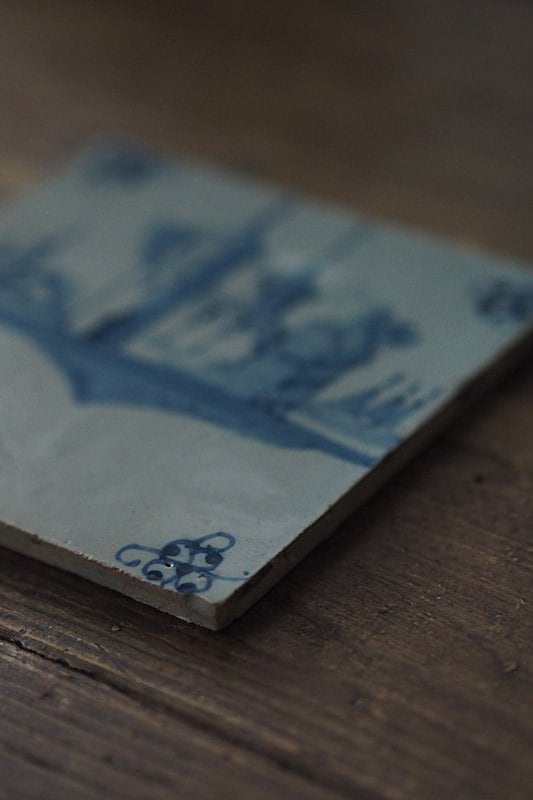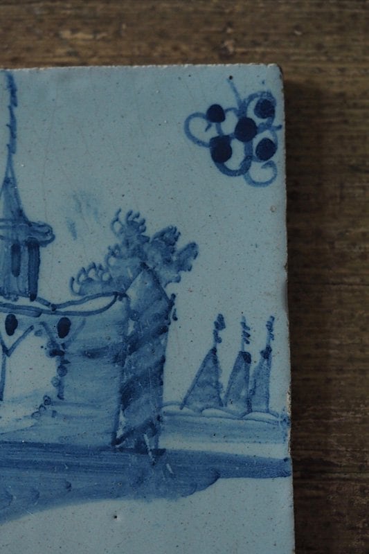 陽の光を浴びた陰影がブルーの釉薬の濃淡で描かれている尖塔を囲む高い城壁と茂る樹々。