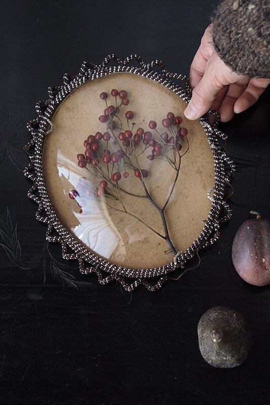 中央に膨らんだガラスのカバーで、野バラの実を仕舞いましたが如何様にも。