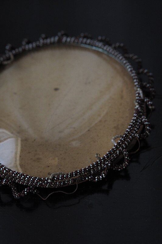 アンティークカットのやや不揃いなビーズ装飾が周囲を巡り、抑えた華やかさをもたらしている。