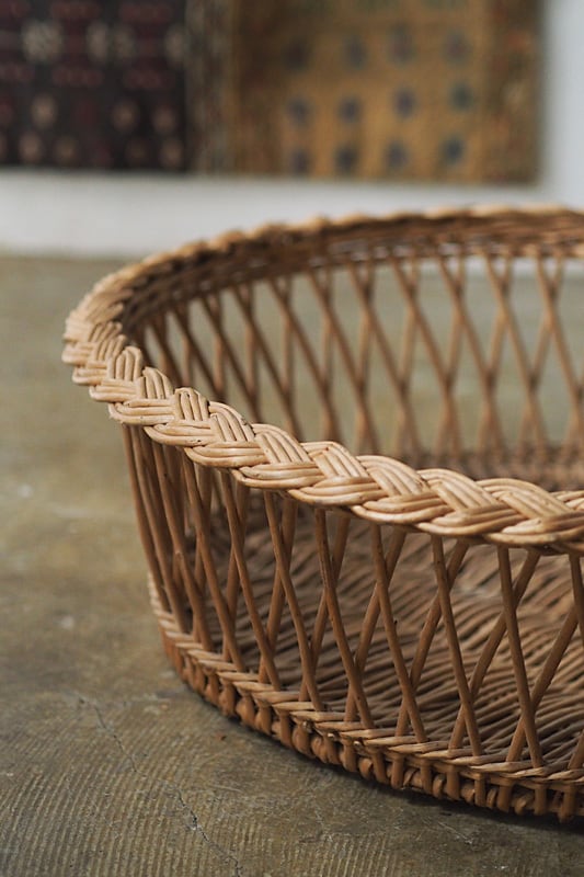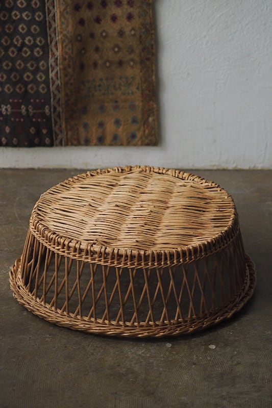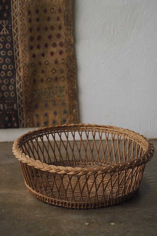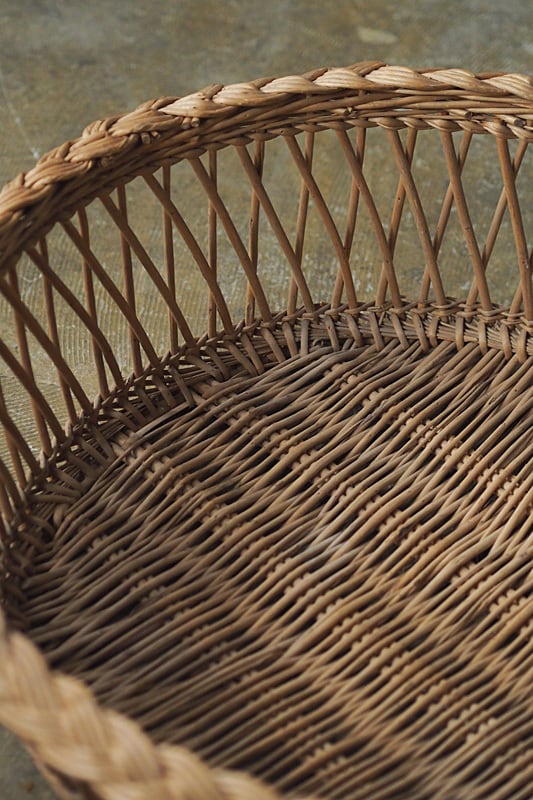 腕で輪っかを広げて、いや、大きい方はそれ以上の容量、広く浅めで底面などに虫喰い穴御座いますが洗濯物カゴにしては持ち手が無いし側面のクロス編みが甘い気が。