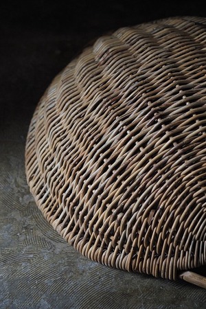ハーブや果物、葉物と多様な作物の収穫に使われていた、ミレーの落穂拾いに登場しそうなカゴ。広く開口が開いた窪みに紫陽花のドライを沢山投げ入れし大きなファーマーズテーブルの中心に据える情景。