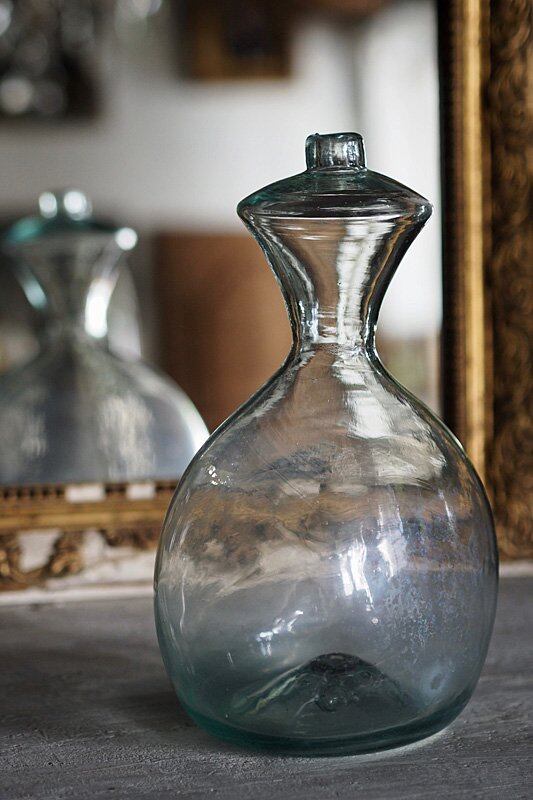 答えは窄まった胴にぶら下げ用の紐を掛け、シャンパンなどを注ぎ牧羊先まで携行した南仏、特にローヌ=アルプ地方の羊飼いが使った古のガラスボトル。