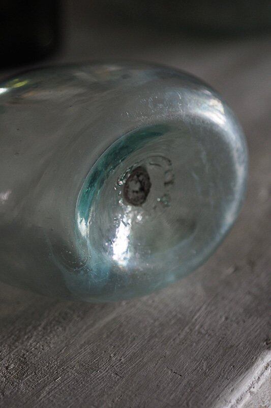 底面内部に白い付着物、ガラス片面だけ地中に埋まっていた時期があったのか、控えめに銀化現象が起こっています。