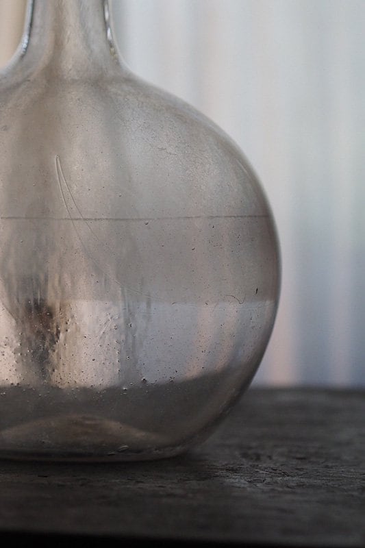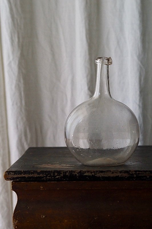 横向けるとやや前屈み、鶴首はガラスを伸ばした時真っ直ぐ上には向かなかった香水の調香前の原液を入れていたガラス瓶。