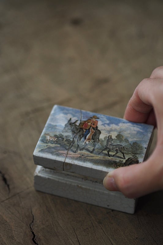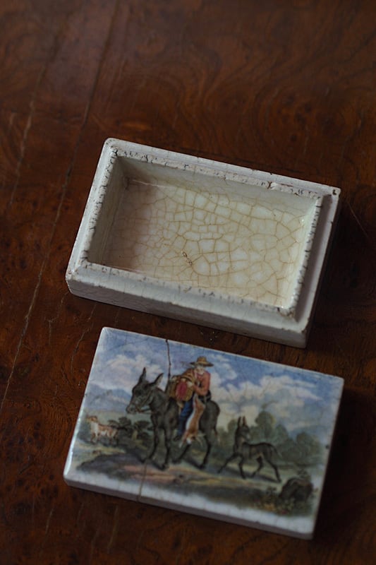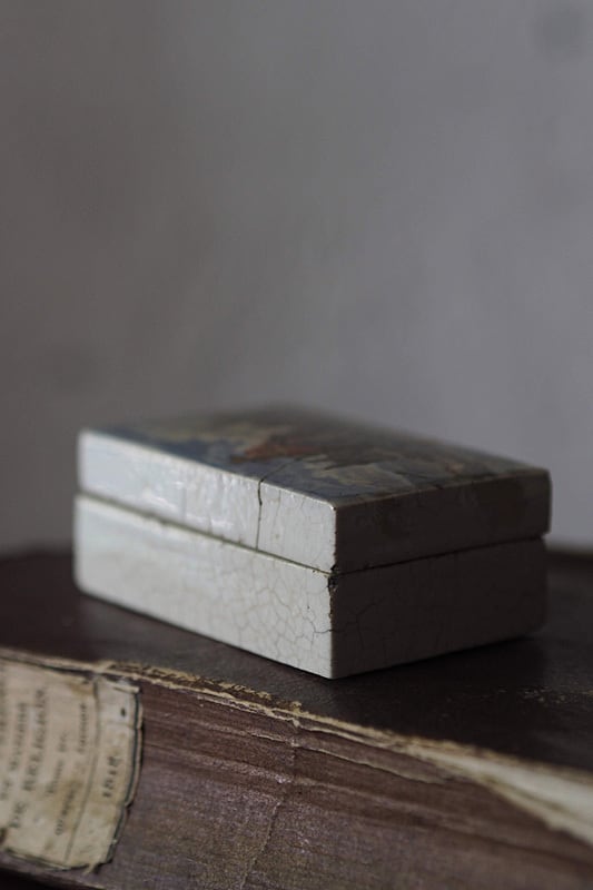 カチッと音を立てて閉まるスレート板を連想、石室な形にそそられる。19世紀初頭にイギリスのスタッフォードシャーに設立したPratt窯、その代表作の多くは陶器に多色彩転写し銅板印刷の絵本の世界を体現したもの。この形、小物入れや底に別珍を敷いてリングケースに良いミニマムさ。1840年代初め、Pratt社に随伴したアーティストのJ.Austinが物語の道筋、デザインを起こしたロンドンの原風景、また既存絵画の縮小表現などが丁寧な発色遣いで蓋に表れている。ケースの質感、触ればしんとした冷たさが伝わる。