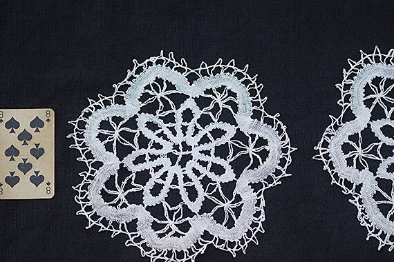 蜘蛛の糸の様に細い繋がりを最初の六角形から無数の時間、人の手が紡ぎ出したレースという装飾。その断片から全体像まで、人が辿った糸の美しい変遷を垣間見える幸せよ。