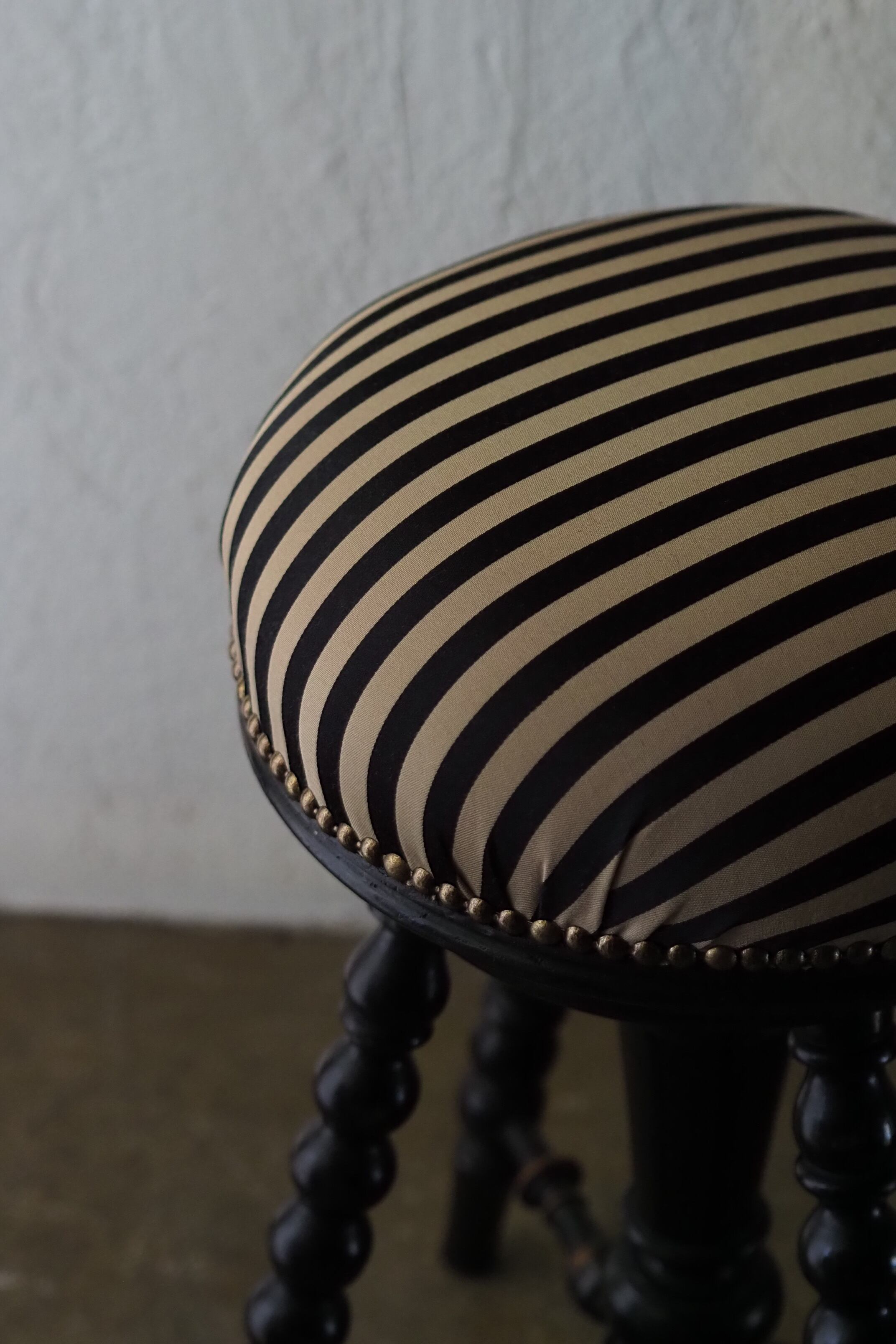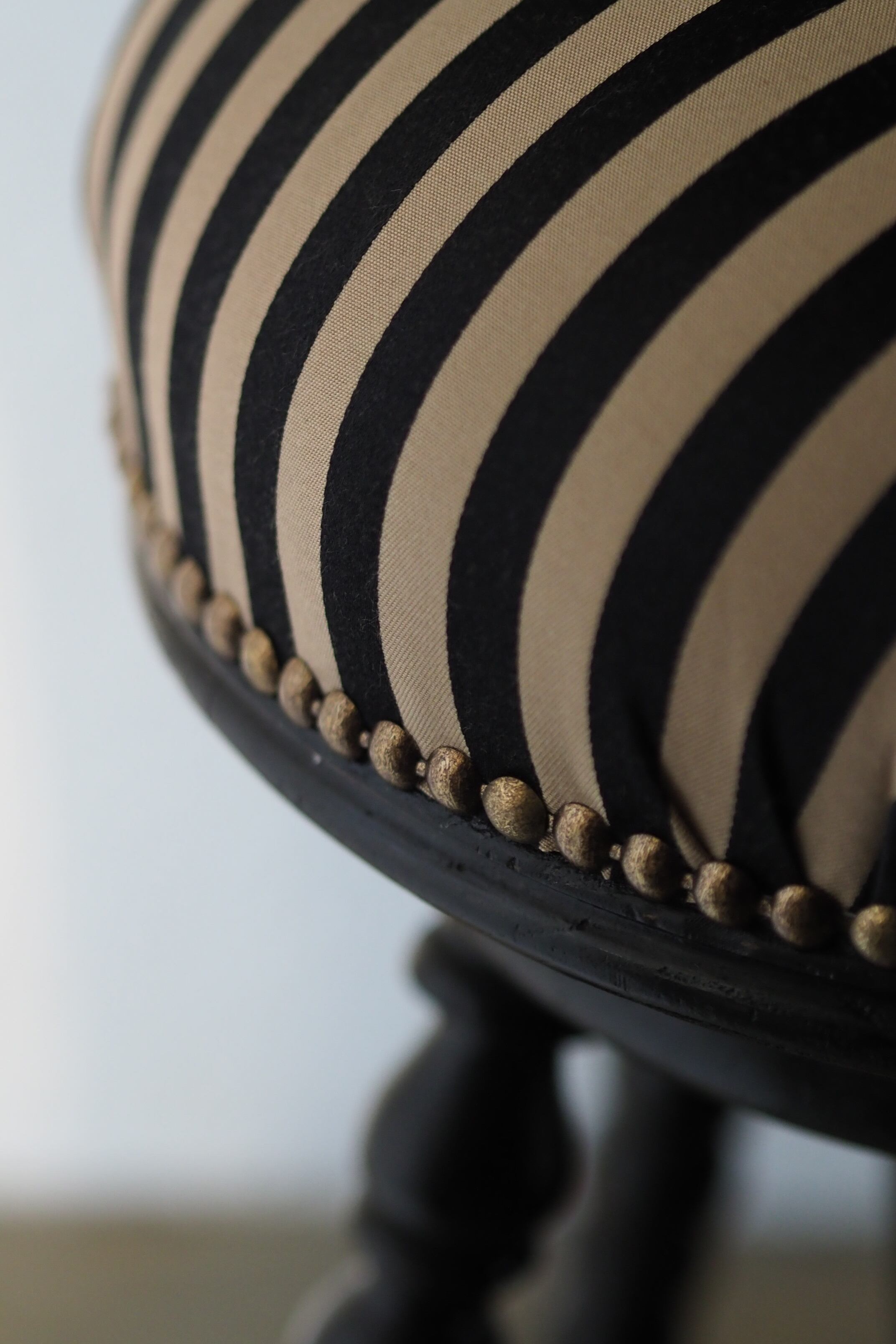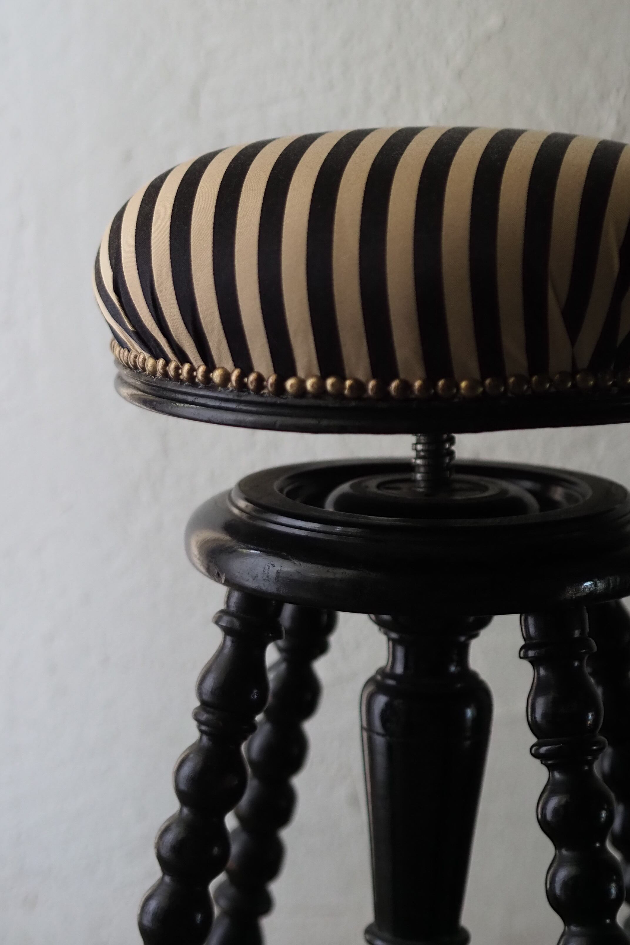 艶々し過ぎていないピアノ塗装、白い壁にピリリと嵌まるシックな黒い脚で座面はイタリア製のモダンな極薄いシャンパンゴールドと黒のストライプ生地で張り替え。