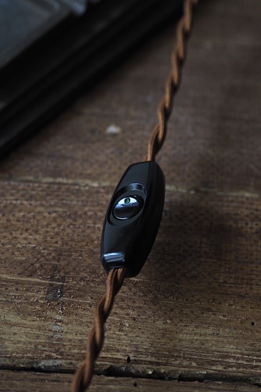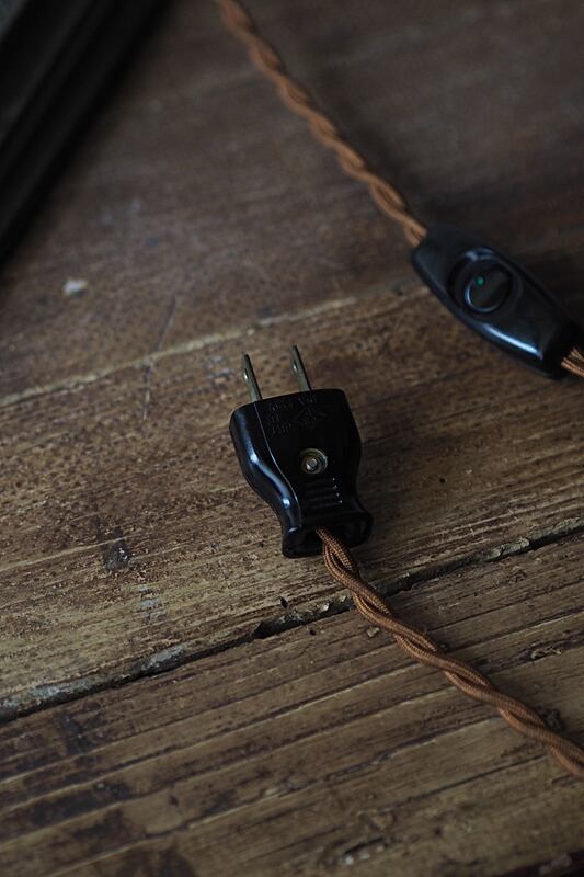 日本到着後照明業者さんに配線して頂きました。配線時鋳物土台のスイッチは使えずブラウン布捻りコードの中間スイッチでON/OFF致します。本体より約2Mコードが伸びております。
