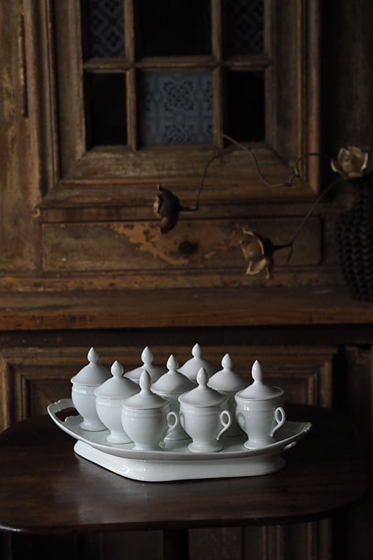 揃いの9個、フランスコース料理に欠かせないムースをサーブする器、白磁のコンポートに乗って。