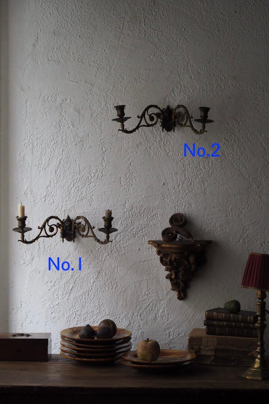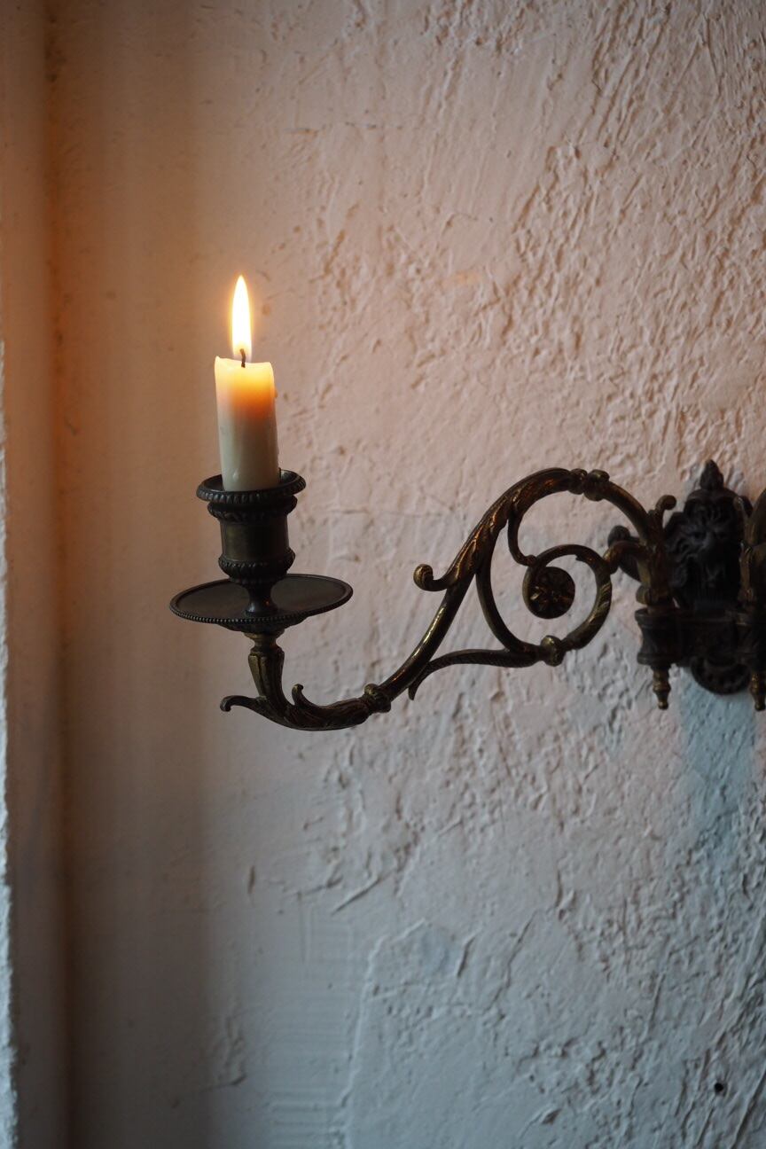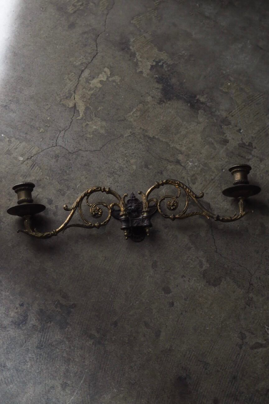 渦巻く羽とボタニカルモチーフが左右対称に、中央にはたてがみなびくライオンというクラシカルなデザインの両アーム壁付け燭台。
