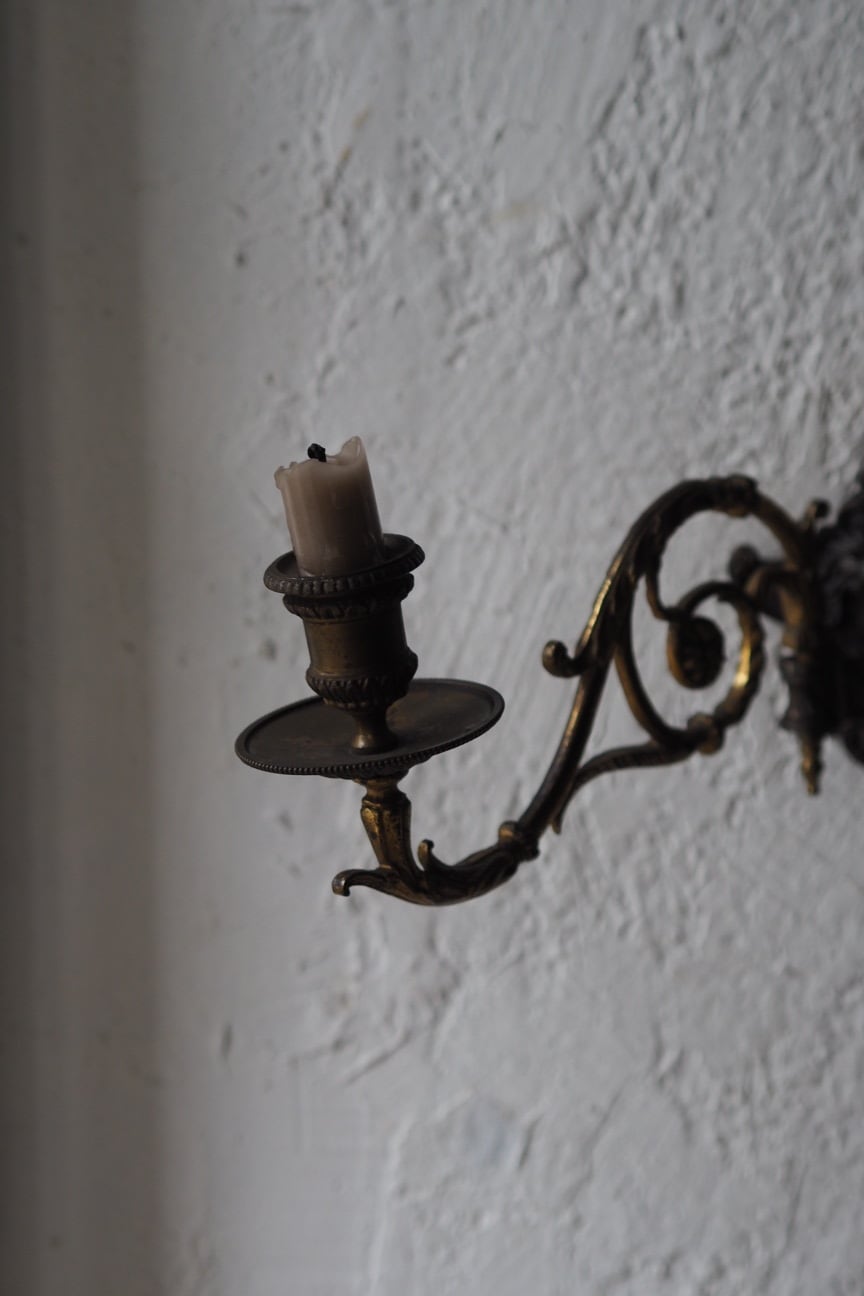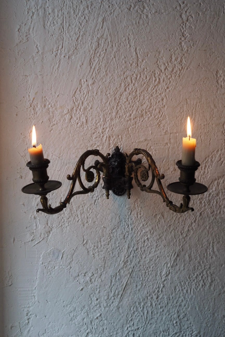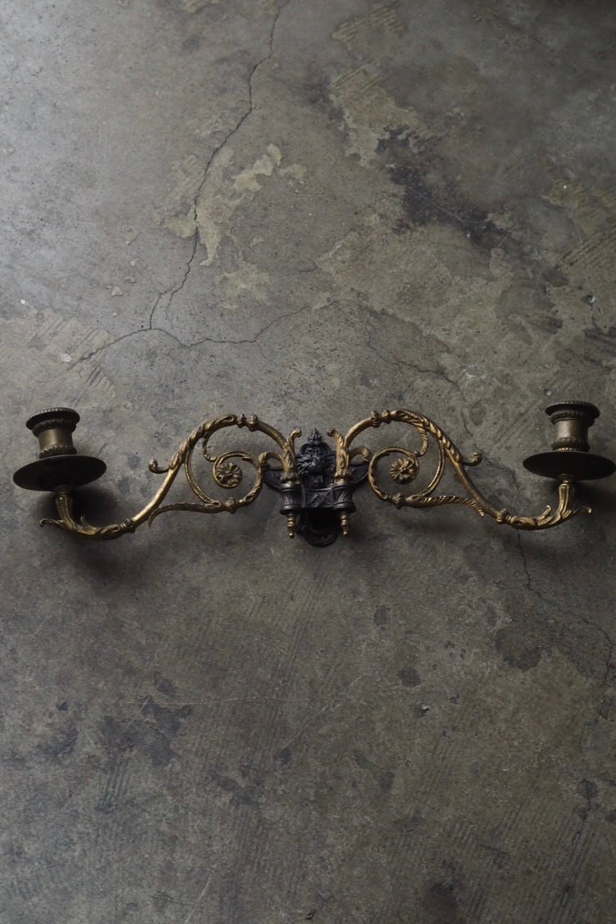 渦巻く羽とボタニカルモチーフが左右対称に、中央にはたてがみなびくライオンというクラシカルなデザインの両アーム壁付け燭台。
