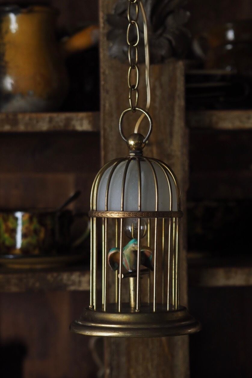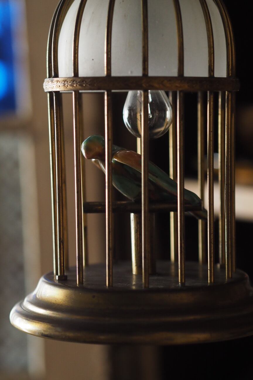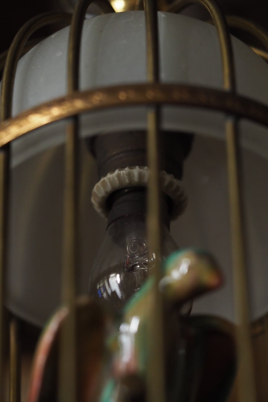 インコに向けた灯りですのでこの照明に明るさを求めずウィリアム・モリスの壁紙を背景に色の競演、溶け込む設えを楽しんで。