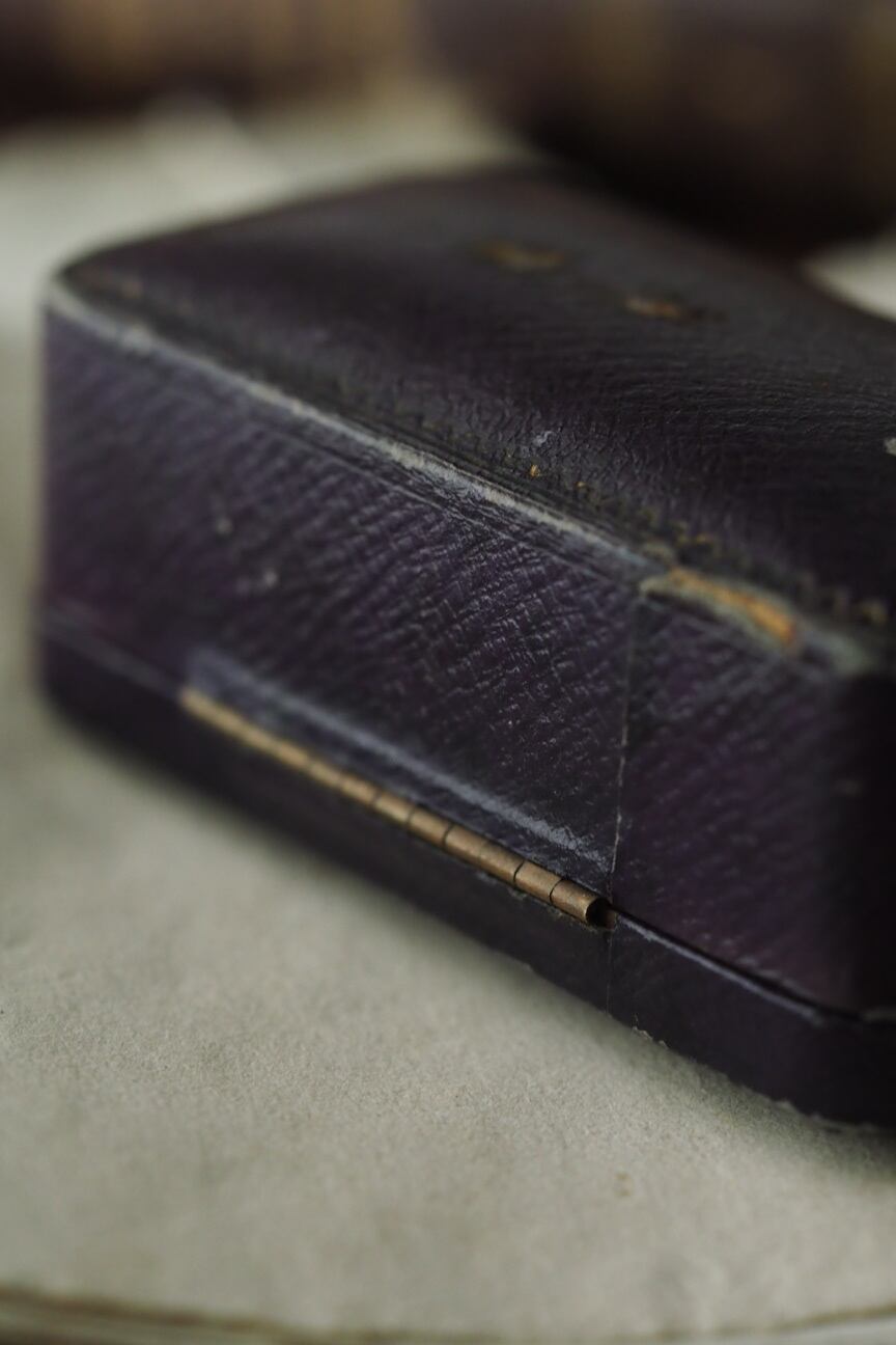 英国王室ロイヤルカラーの一つ、ロイヤルパープルのベルベット生地が張られた腕時計を仕舞った台座(中心が大きく盛り上がっている)、準じて蓋もシックなパープルの革張りの色め、少し明るい場所で眺めれば。