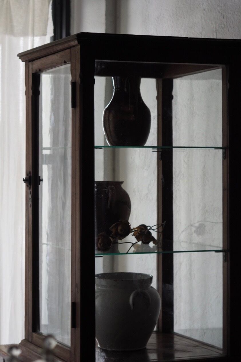 四方ユラユラガラスで透過性高くコレクションの骨董壺、陶器のオブジェ、或いは棚板を取り外して一つアートを飾りフォーカルポイントとなるショーケース。