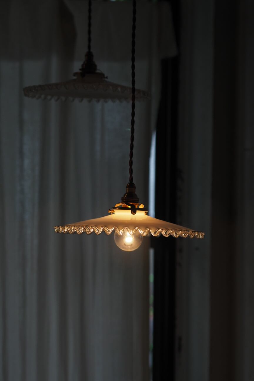 所謂皿傘ペンダントランプで縁にひらひらとフリルが廻っている優しい印象の照明。