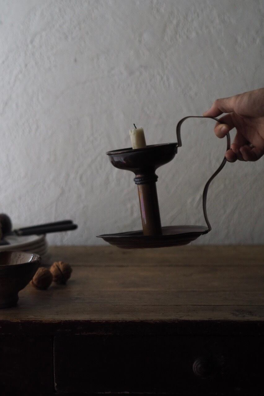 卓上燭台にしては大きめですが燻した銅の質感、シンプルな形で南仏の壺やストーンウェアポット、ピューター食器にすっと馴染む包容力。
