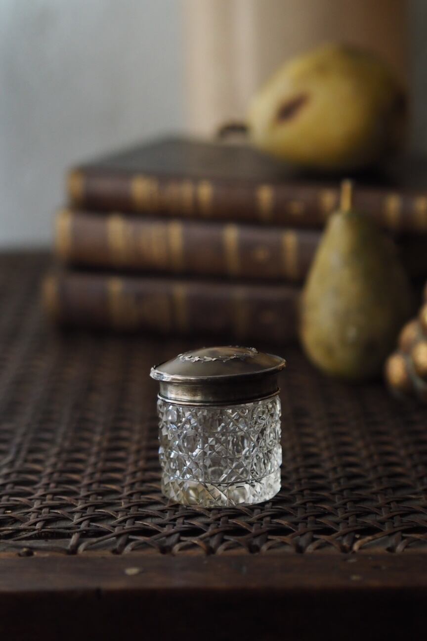 蓋留めと装飾はスターリングシルバー製、バーミンガムの検査機関、1874年から1875年のコールドクリーム入れ。